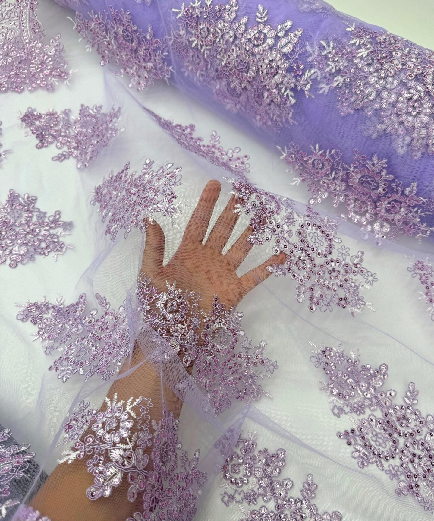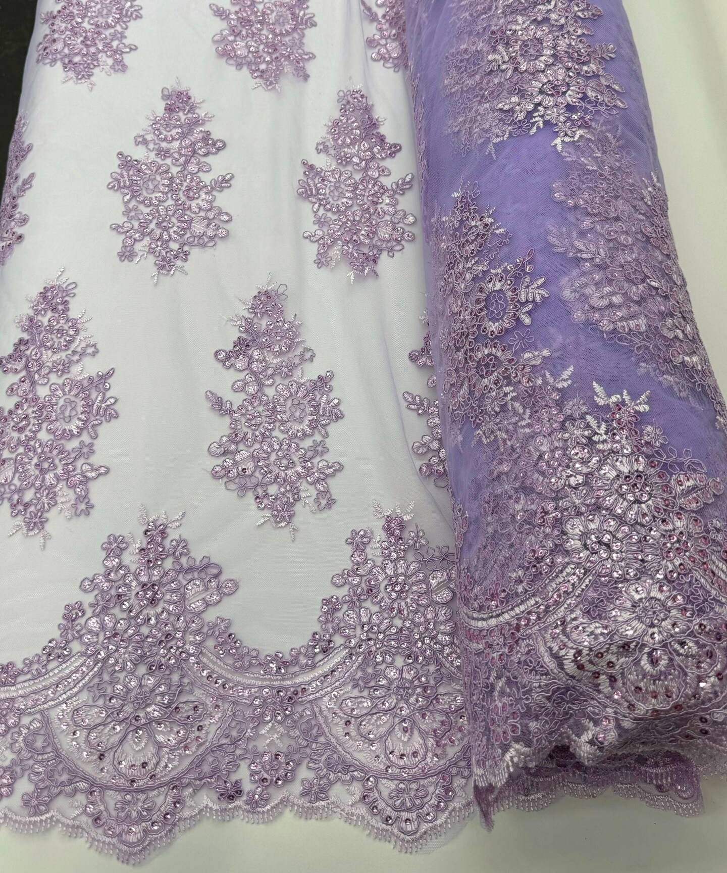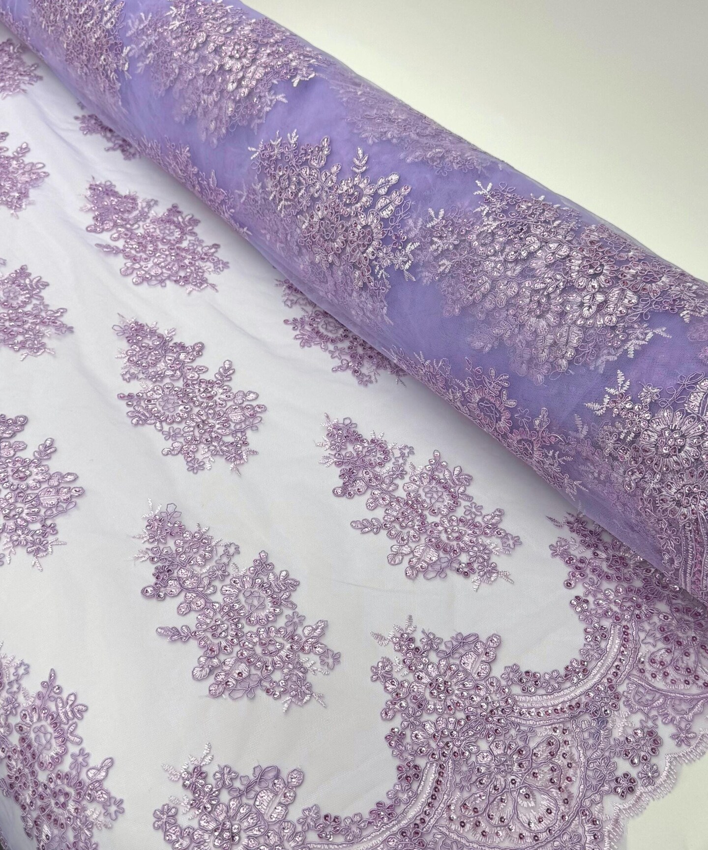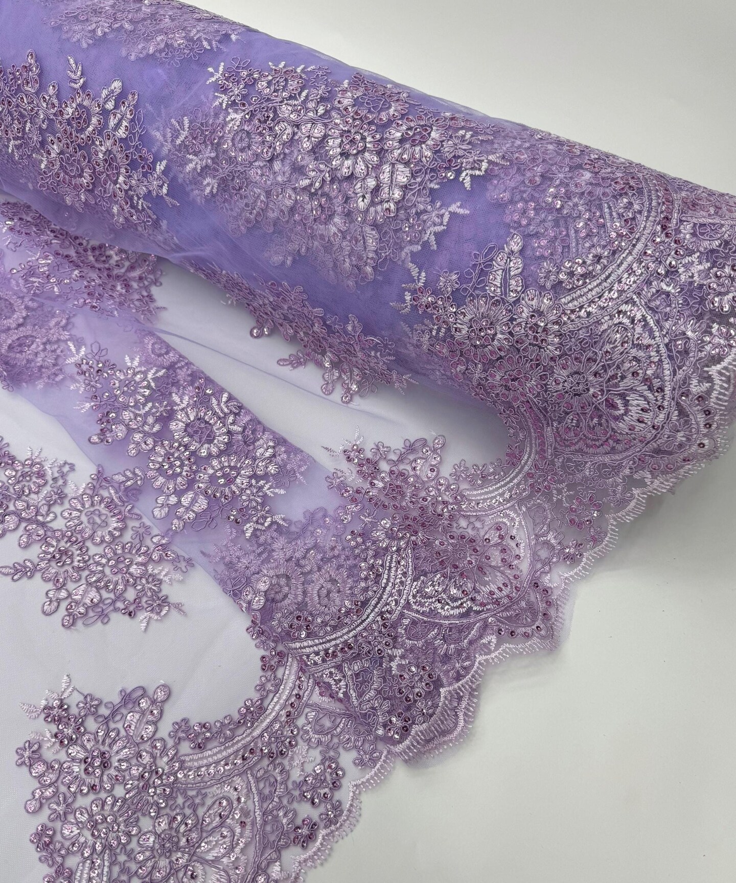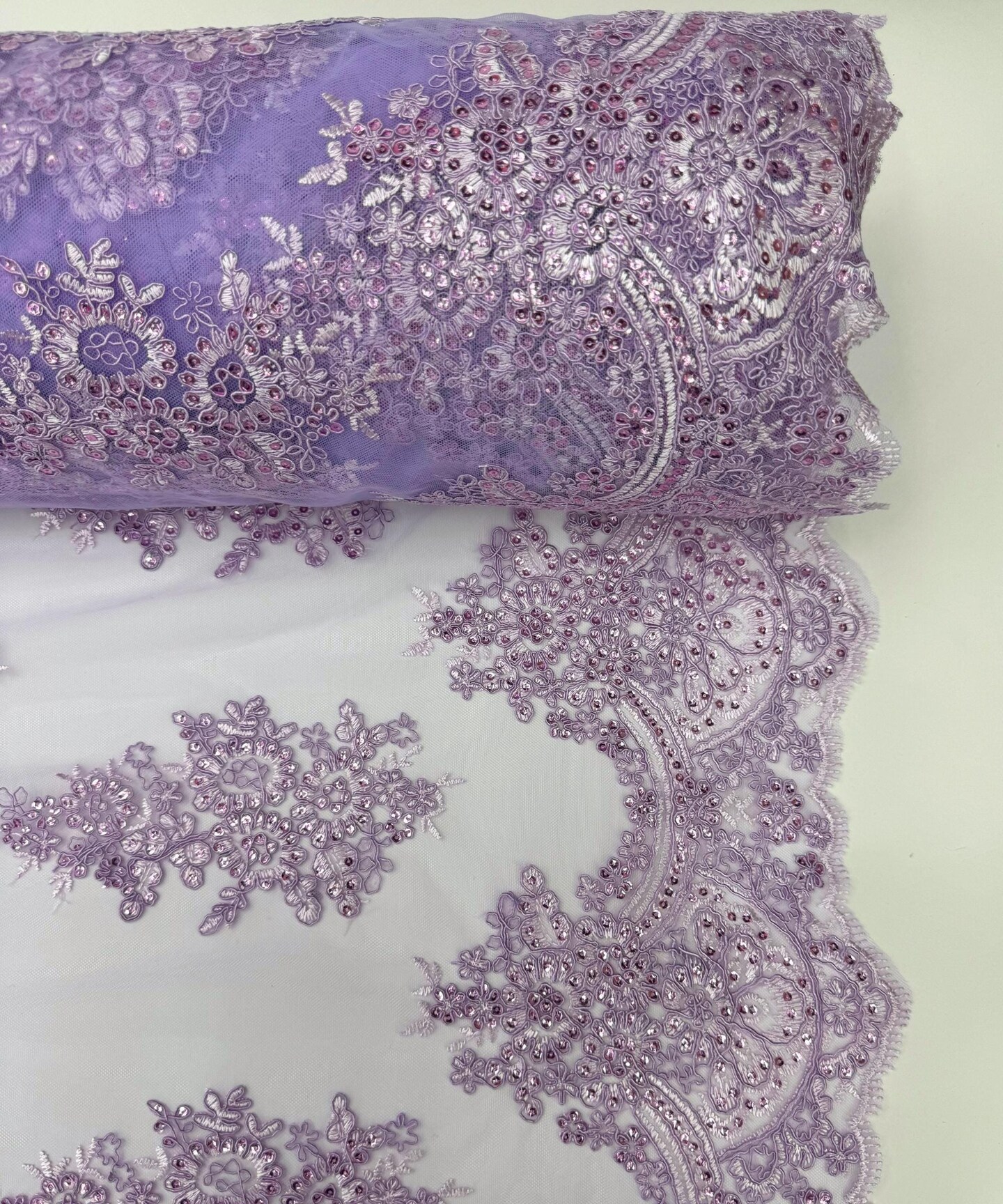 Lilac Sequin Embroidered Lace Fabric by the Yard, 54" Wide Floral Mesh Lace with Double Scalloped Edges