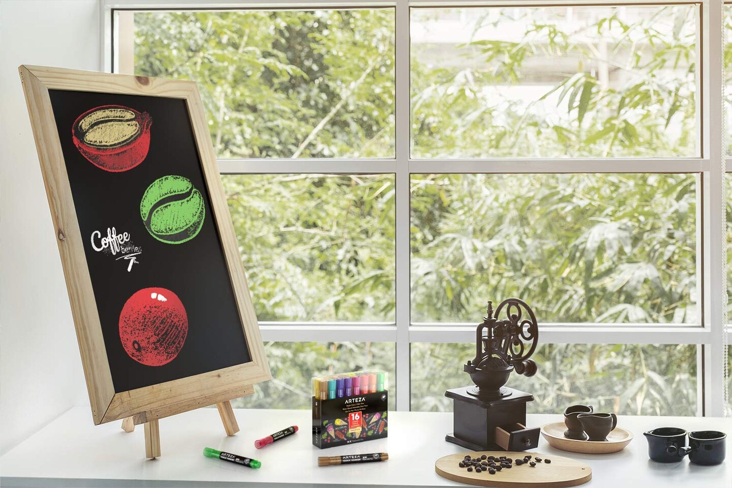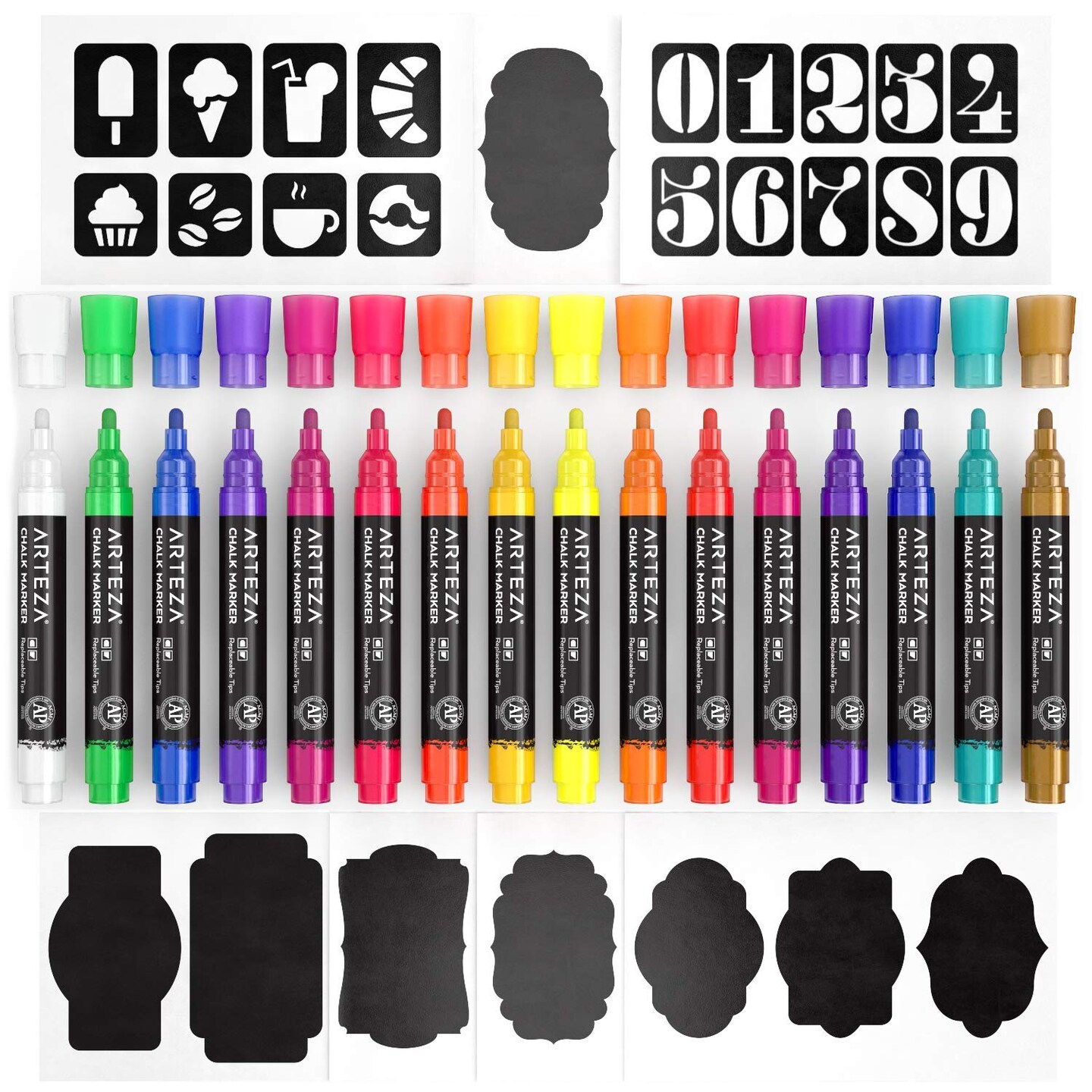 Liquid Chalk Markers, Set of 16 Bright Colors, Water-Based Erasable Chalk Pens with Replaceable Tips, Labels, Stencils & Tweezers for Chalkboards, Glass, Windows & Mirrors