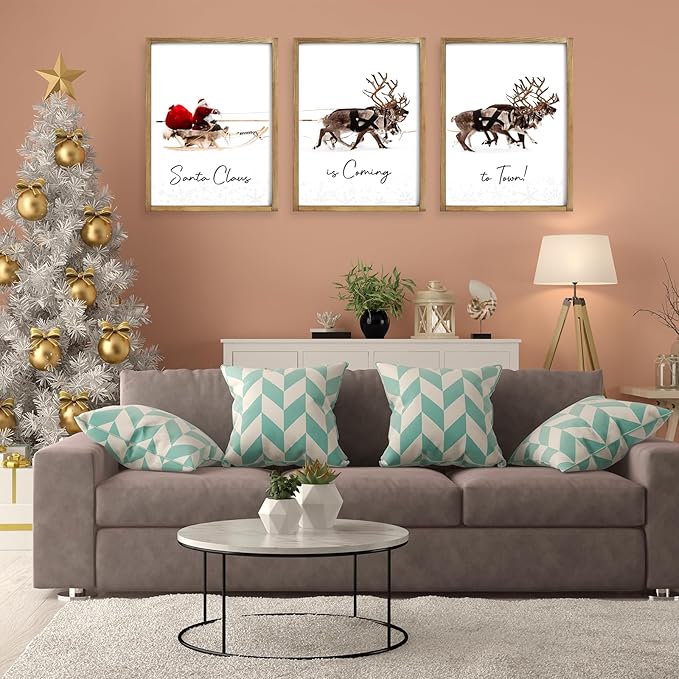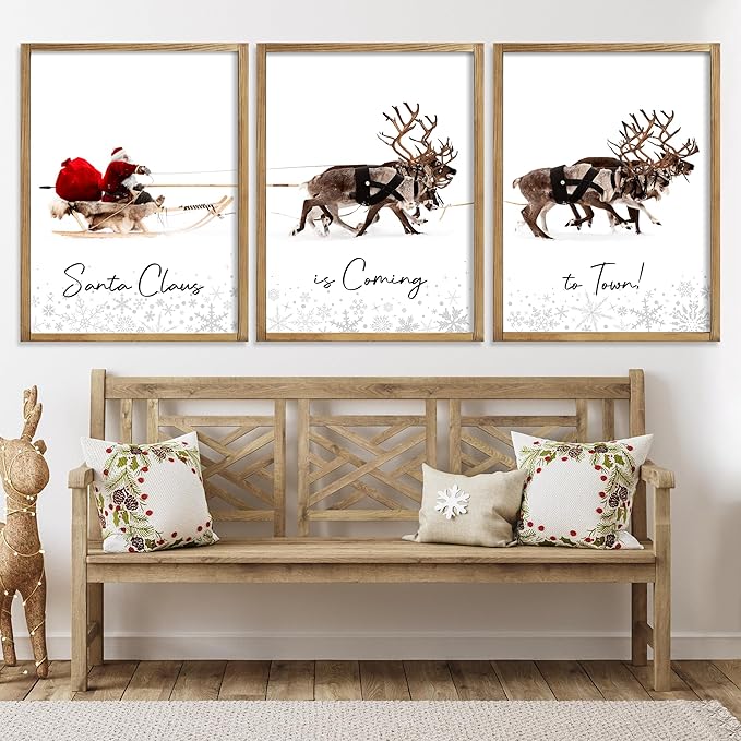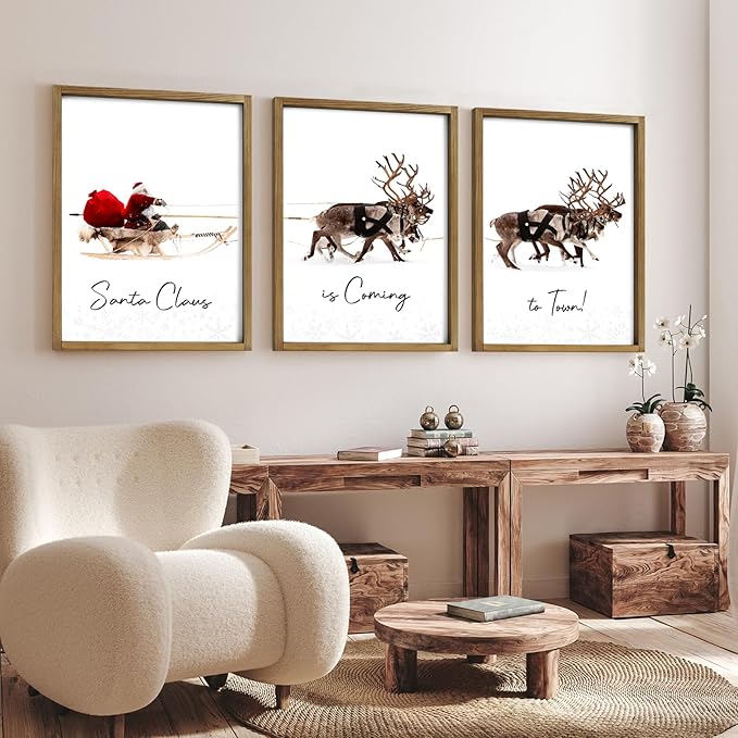 LITIVY Framed Set of 3 Christmas Wall Art Christmas Santa Claus with Sleigh Deer for Christmas Wall Decor Prints Xmas Sign for Home Decor Christmas Decorations(12"x16", Brown)