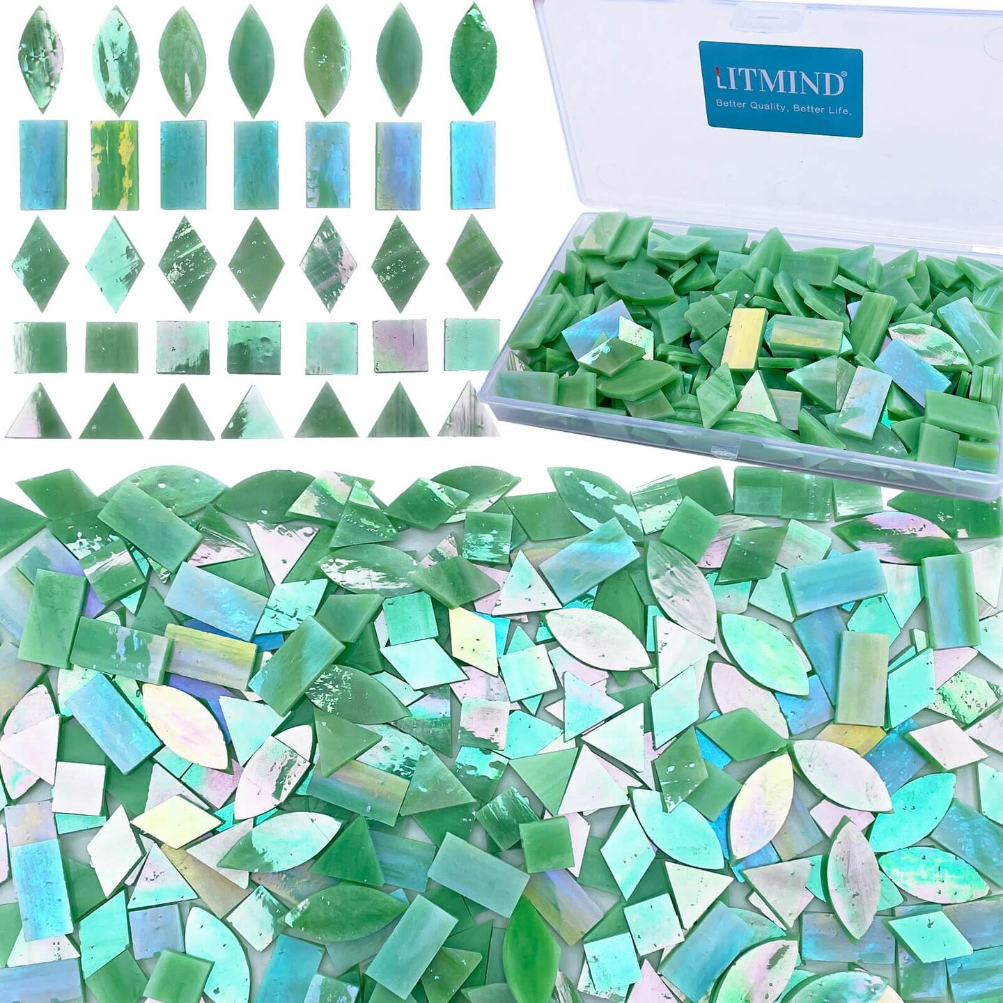 LITMIND Iridescent LightGreen Stained Glass Mosaic Tiles for Crafts - 240 Pieces, 5 Shapes Mixed (Rectangle, Triangle, Rhombus, Square, Leaf) - Ideal for Mosaic Making Projects and Beginners