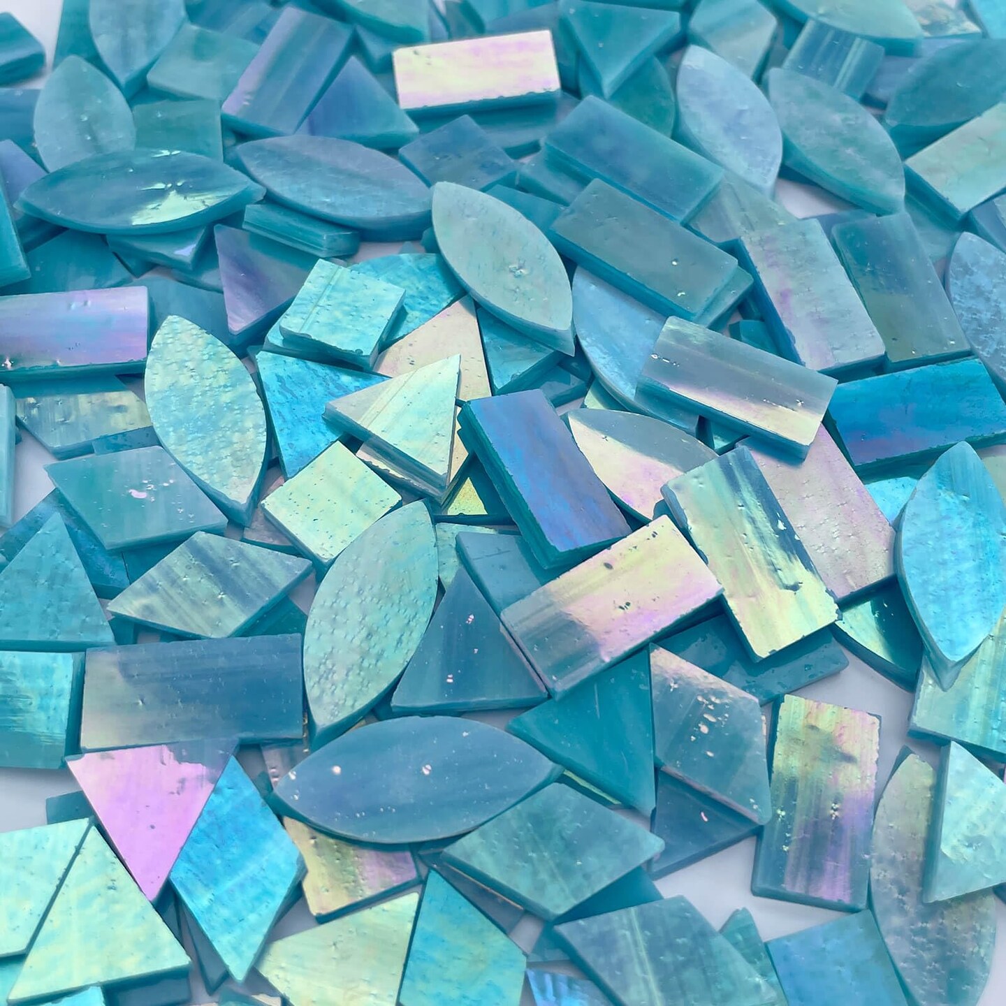 LITMIND Iridescent SkyBlue Stained Glass Mosaic Tiles for Crafts - 240 Pieces, 5 Shapes Mixed (Rectangle, Triangle, Rhombus, Square, Leaf) - Ideal for Mosaic Making Projects and Beginners