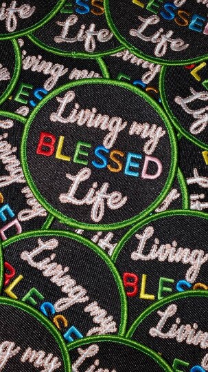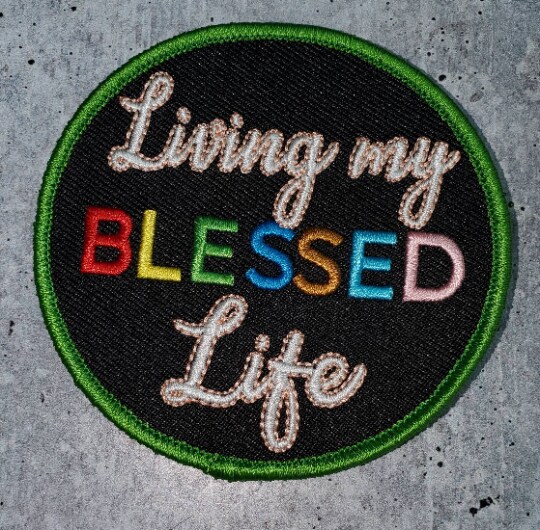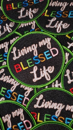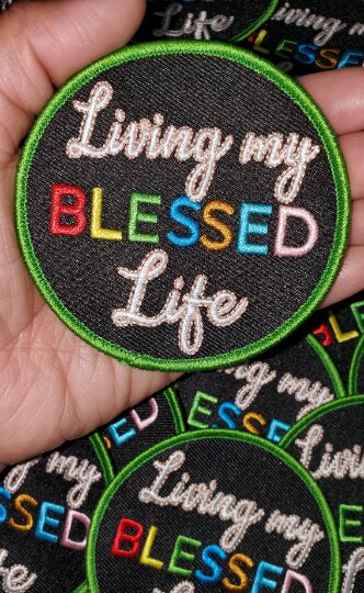 "Living my Blessed Life" Circular Badge, Iron on Embroidered Patch, Positive Applique, Size 3" inches