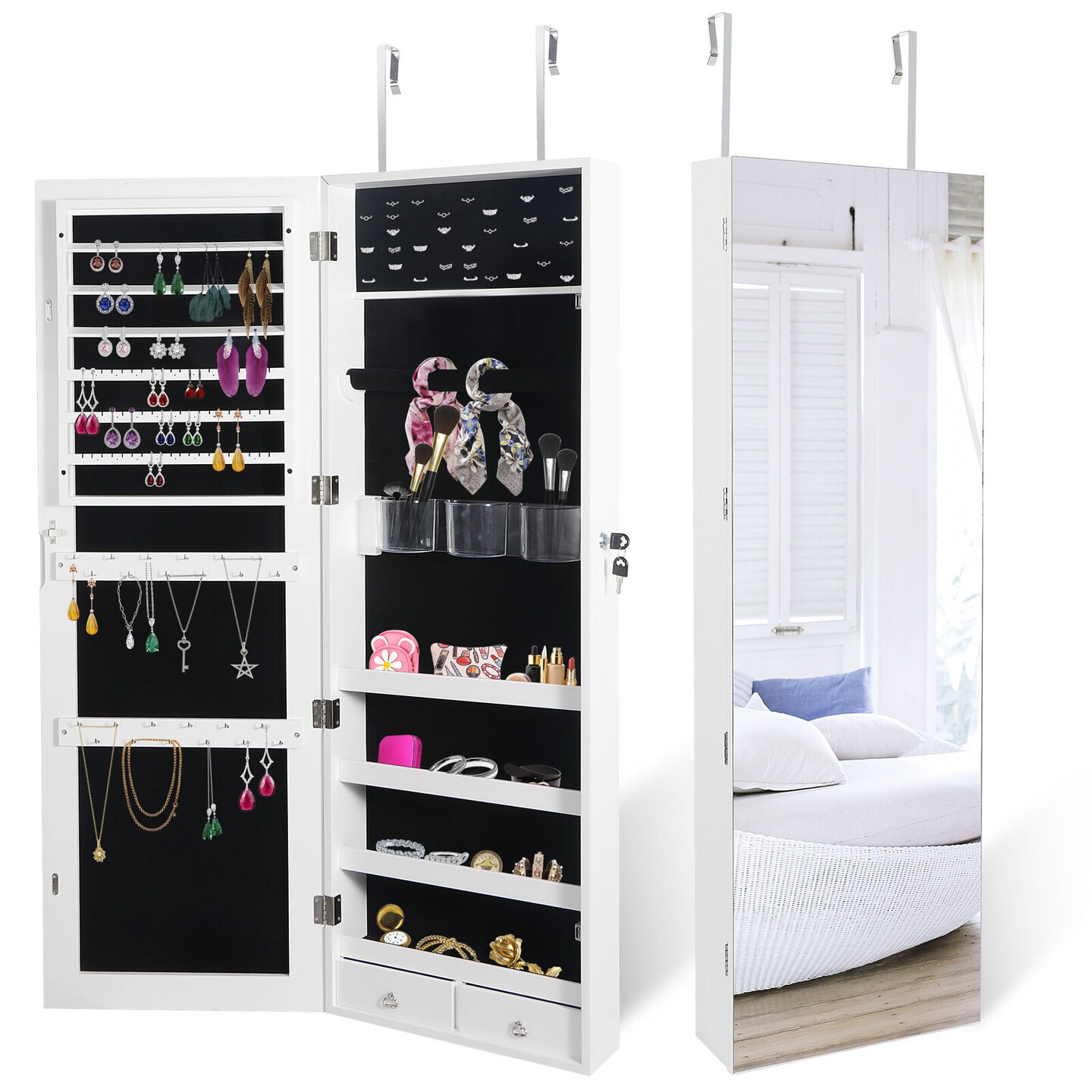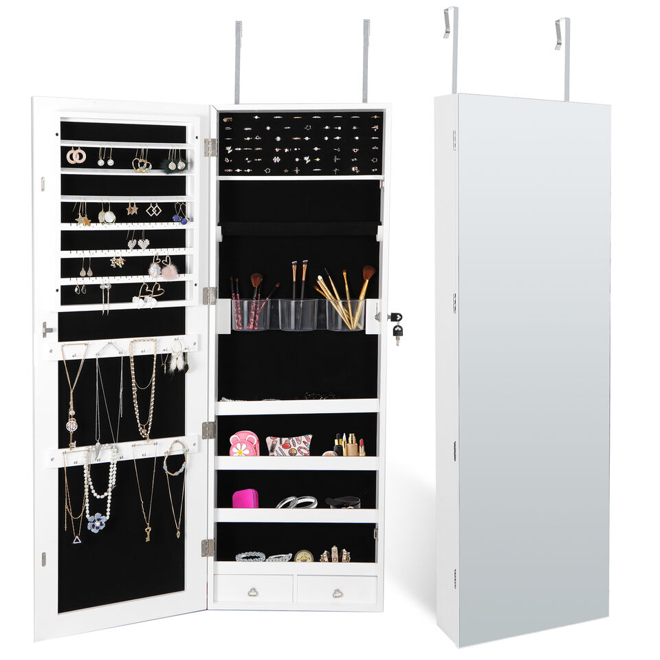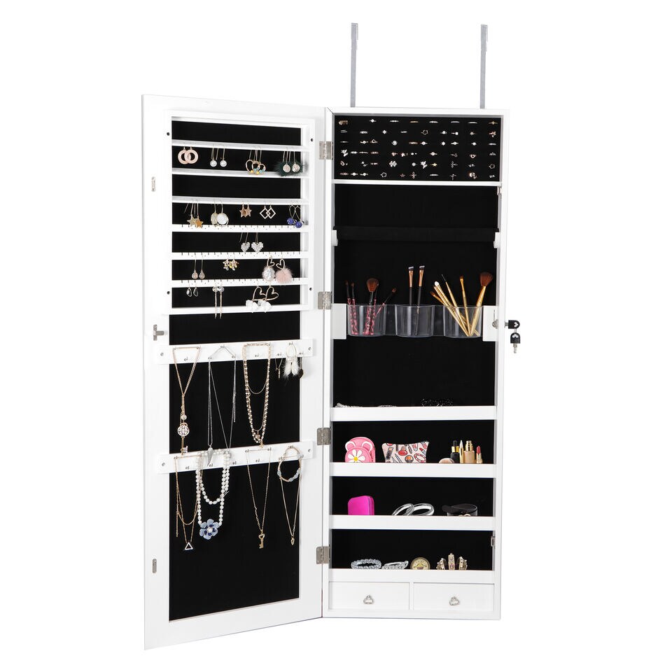 Lockable Jewelry Cabinet Jewelry Armoire Wall Door Mounted w/Frameless Mirror.