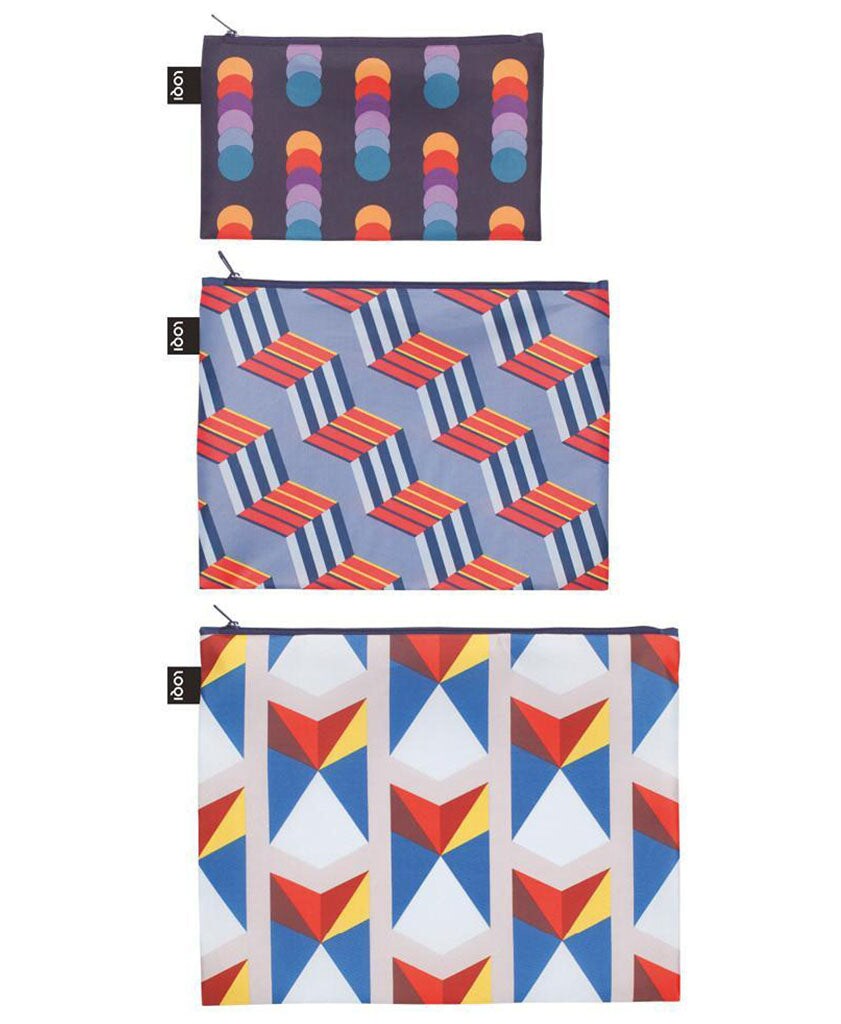 LOQI Geometric Zip Pockets, Set of 3, Circles, Stripes, Triangles