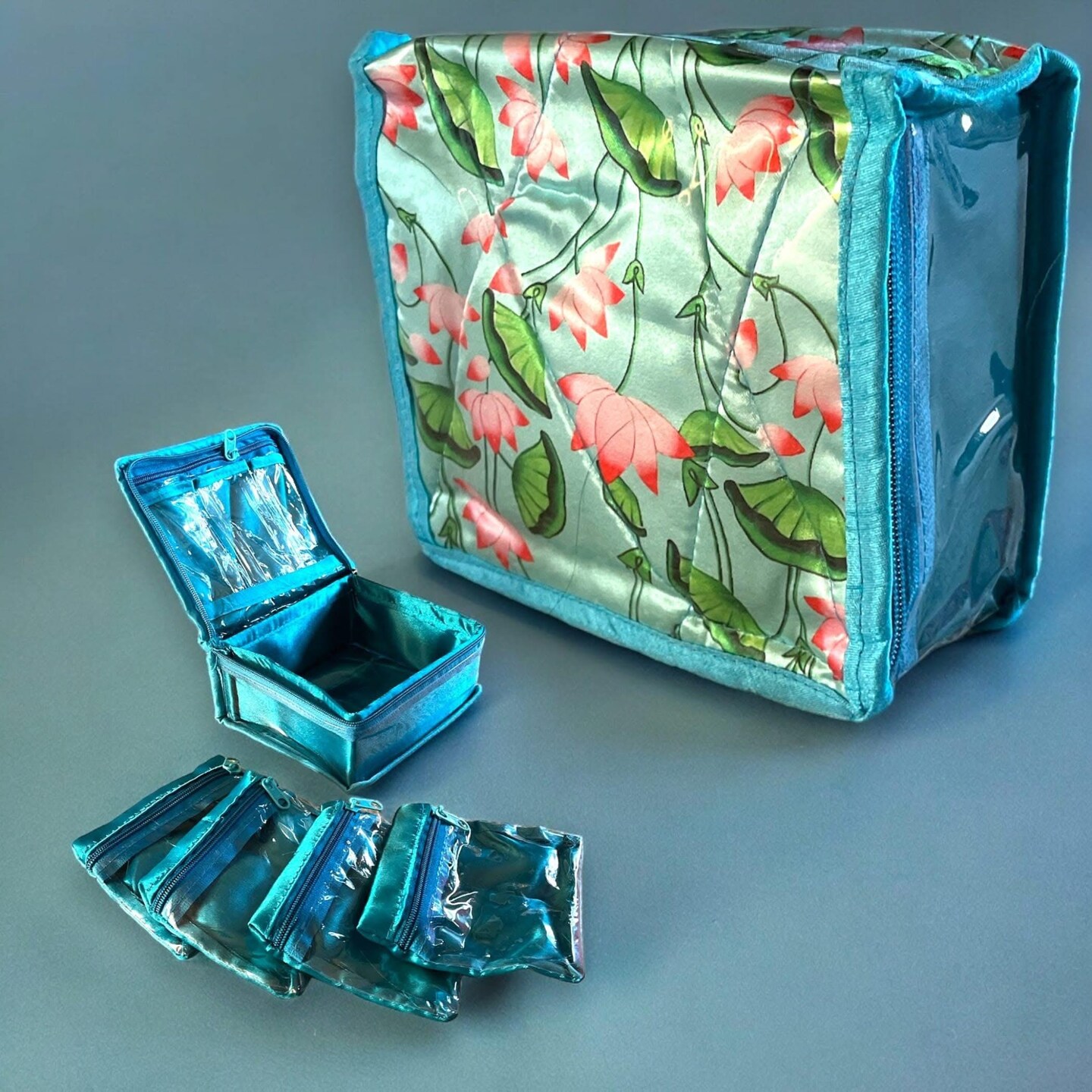Lotus Print Indian Jewelry Box Satin Pouches Jewellery Traveling Organizer Storage Bag with 4 Transparent Pouches Indian Wedding Favor Bridesmaid Gift