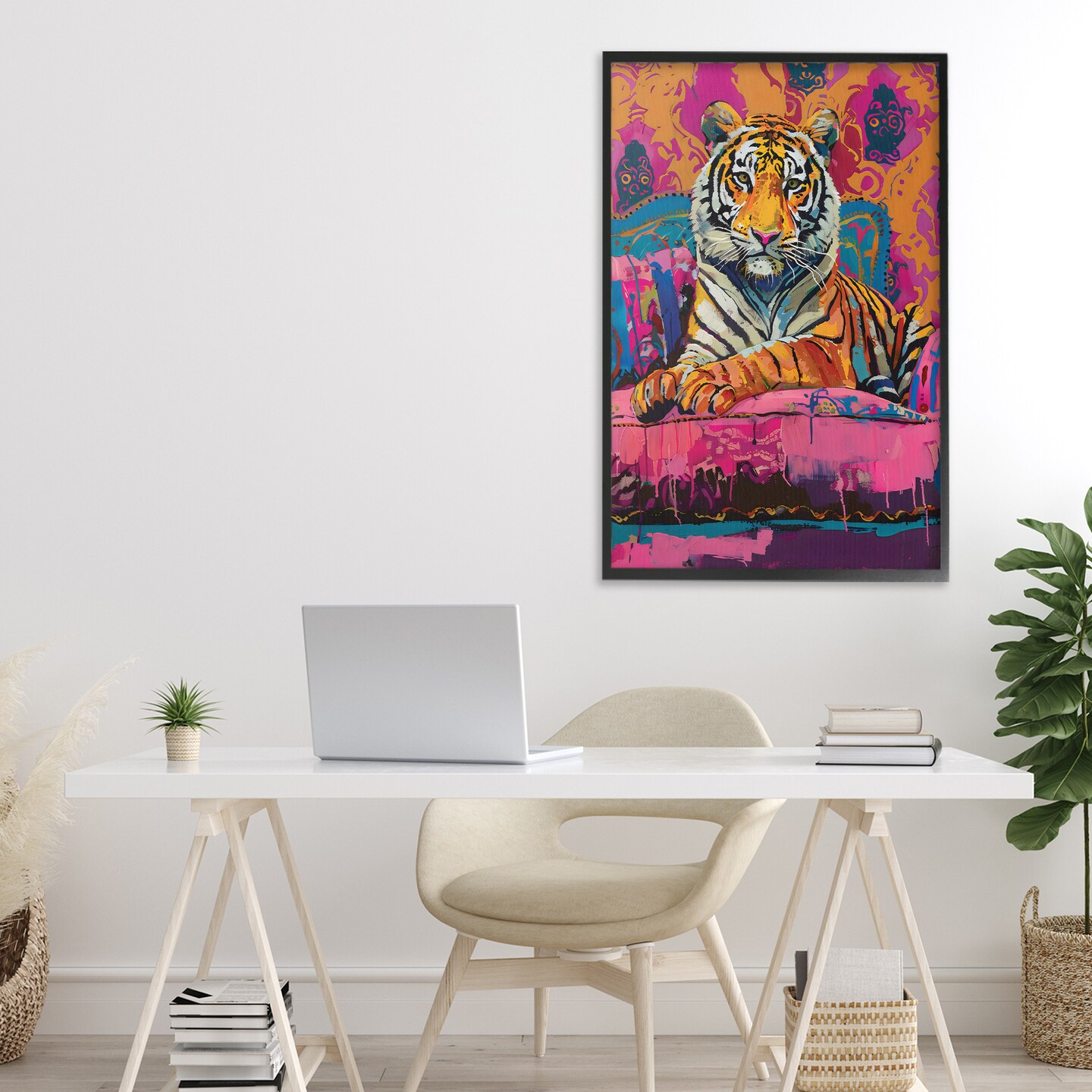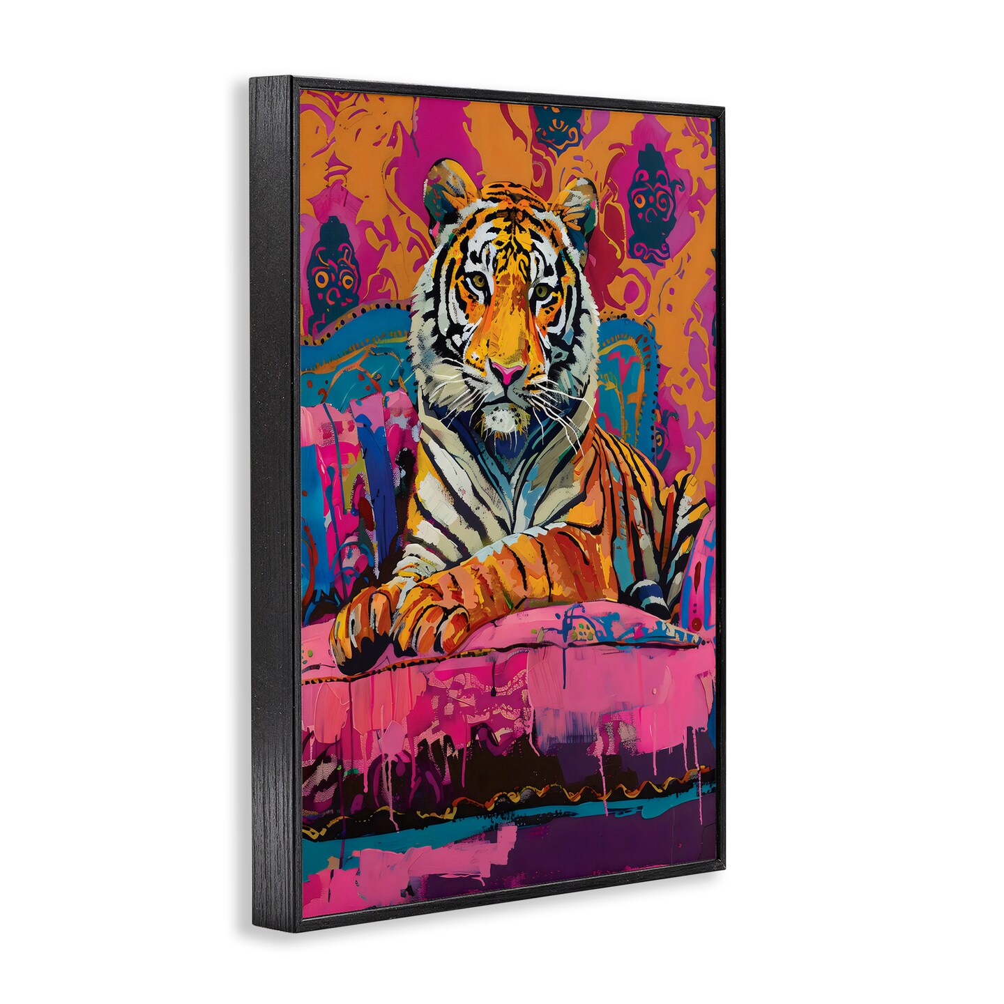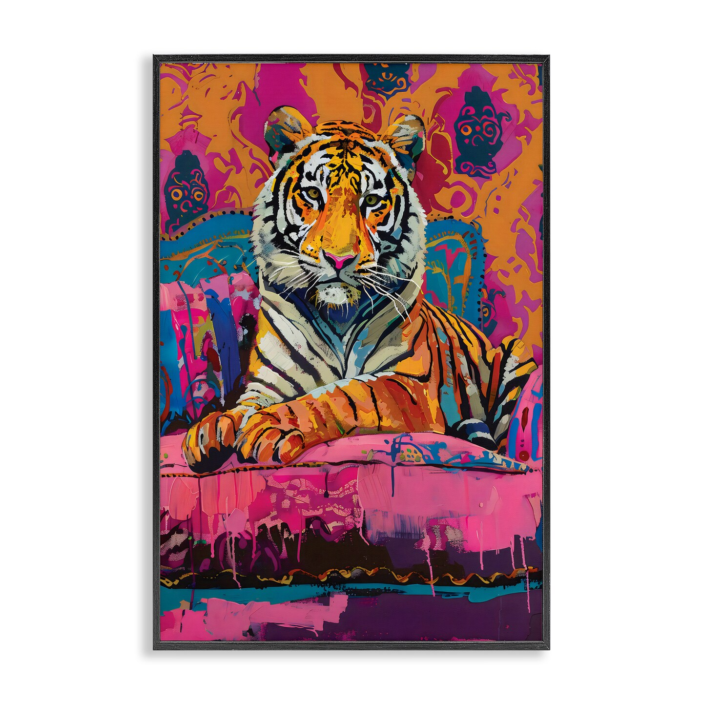 Lounging Tiger over Orange Pink Framed Giclee Art
