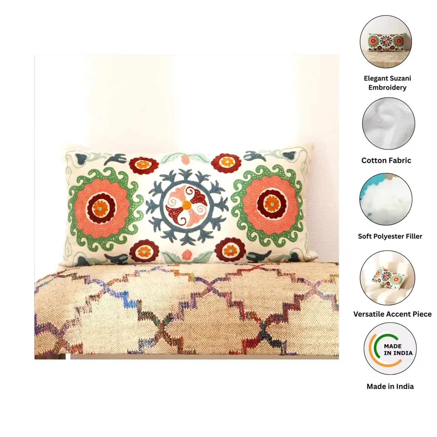 Lumbar Pillow | Suzani Embroidered Multicolor Pillow – Decorative Boho Cushion for Stylish Home Décor | 26"x14"