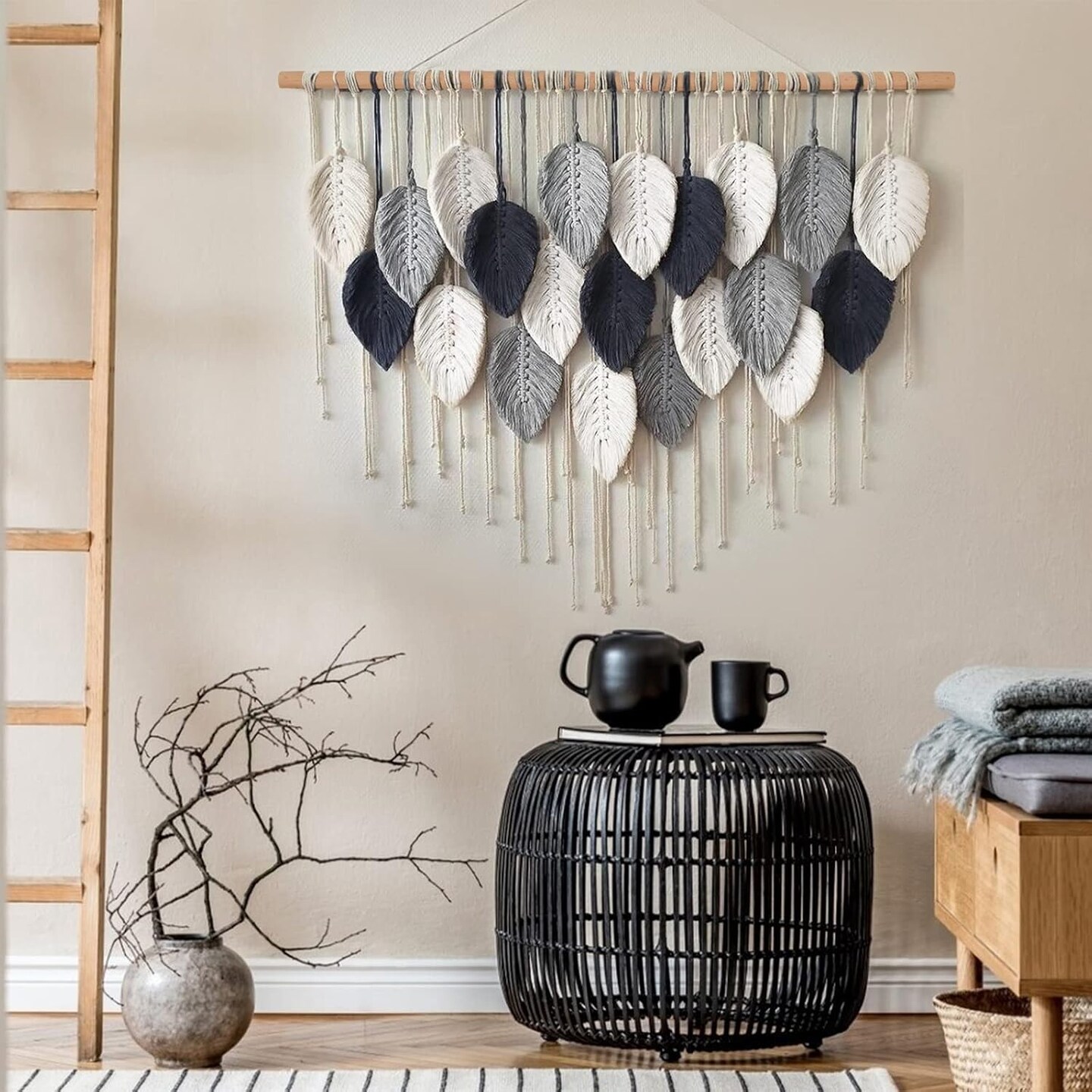 Macrame Wall Hanging — Large Bohemian Leaf & Feather Woven Tapestry, Handmade Chic Wall Art for Bedroom, Living Room, or Apartment, 39"