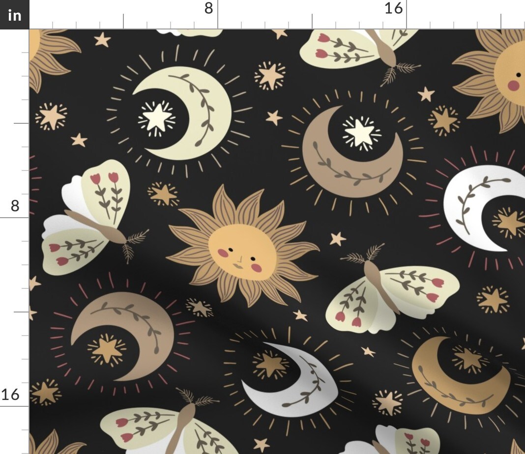 Magic Stars Dark Night Sun Moth Moon witch celestial Custom Printed Fabric by Spoonflower Various Fabrics by the Yard or Fat Quarter