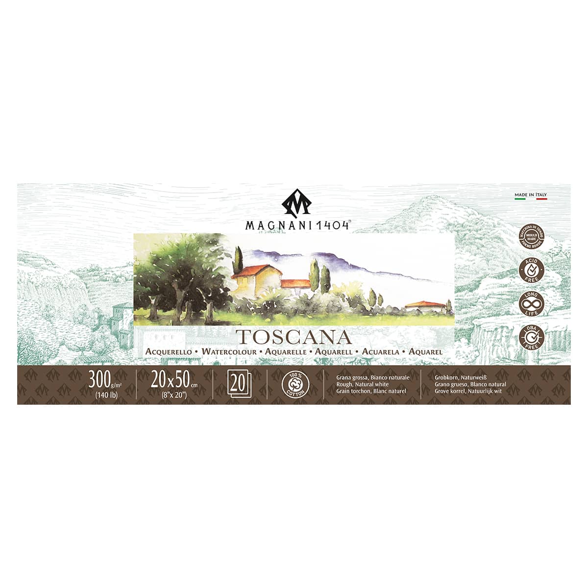 Magnani 1404 Toscana Rough 100% Cotton Watercolor Paper Pad, 20 Sheets, 140 lb, Acid-Free, UV Resistant, Deckled Edges, Vegan Sized Water Color Paper for Artists, Made in Italy