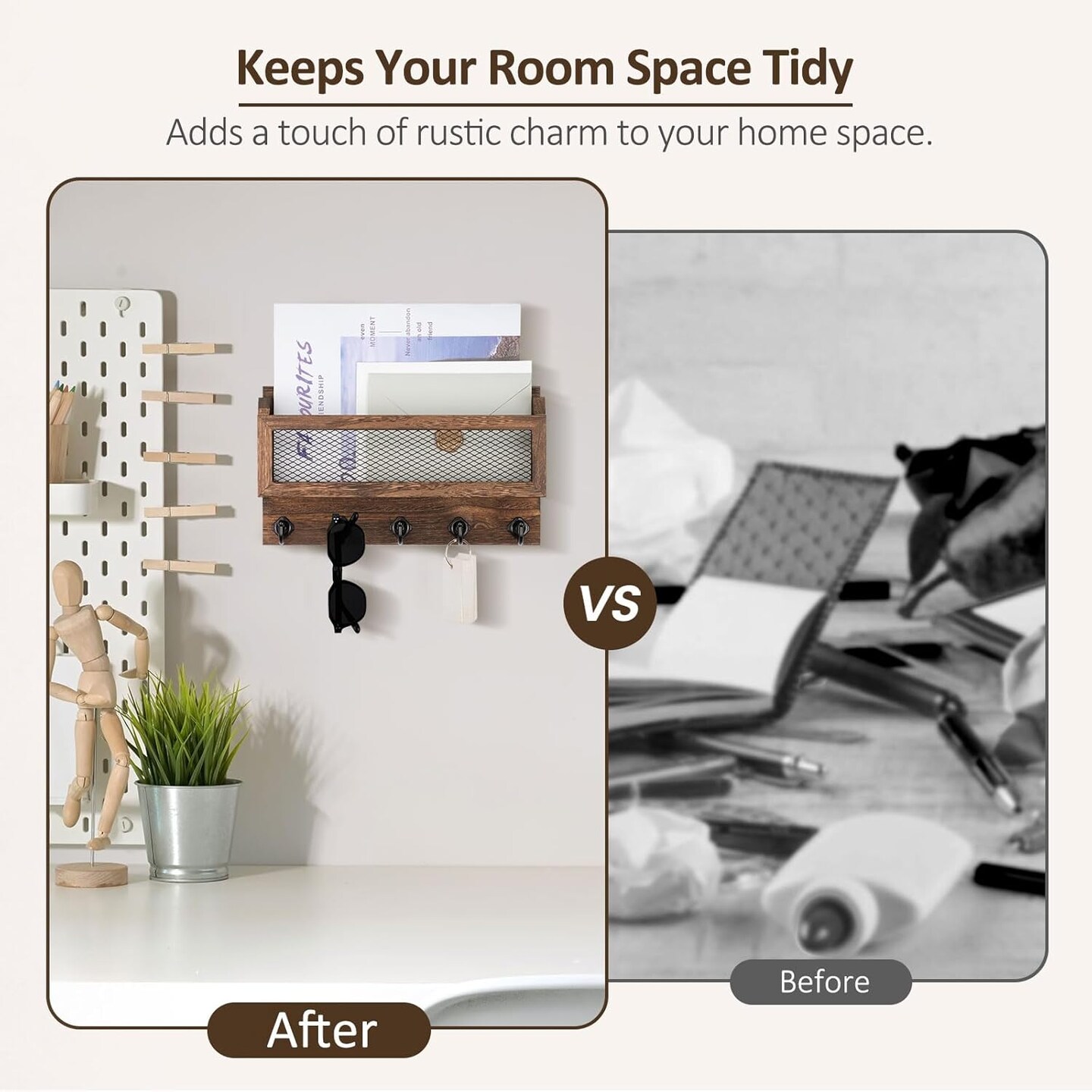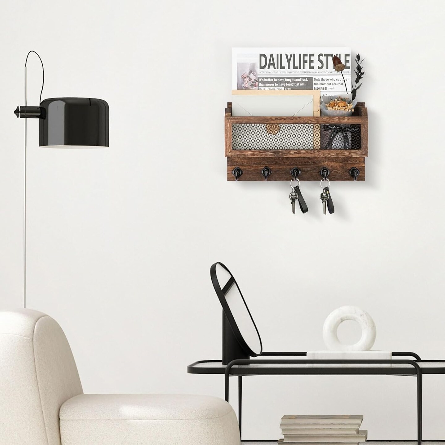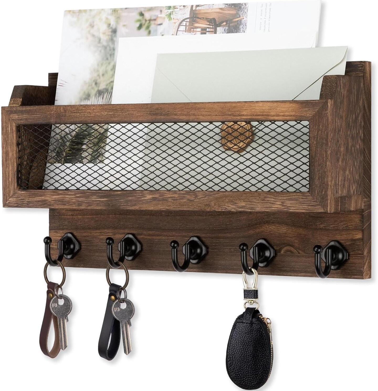 Mail and Key Holder for Wall Decorative, 11 Inch Wooden Wall Key Organizer with 5 Key Hooks, Wall Mount Storage Shelf for Entryway Hallway (Brown)