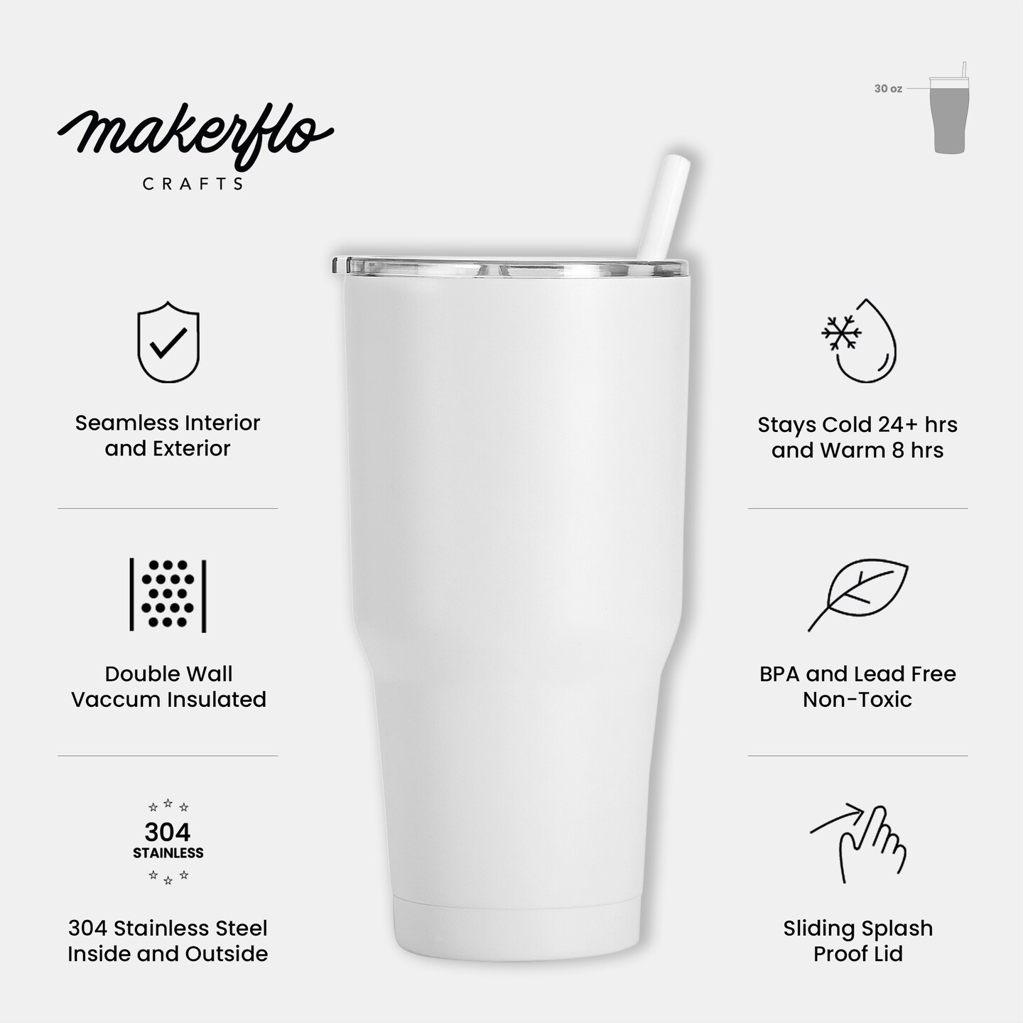 Makerflo 30 oz Powder Coated Tumbler and Handle Sold Separately, Includes a Sliding Splash & Leak Proof Lid, Ideal for Craft and Personalization (Laser Engraving, UV DTF, Epoxy, and Vinyl)