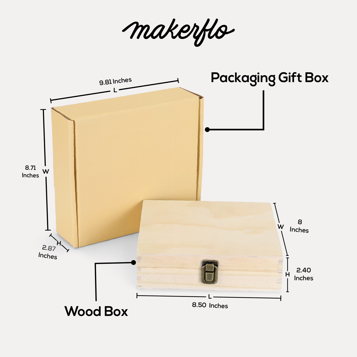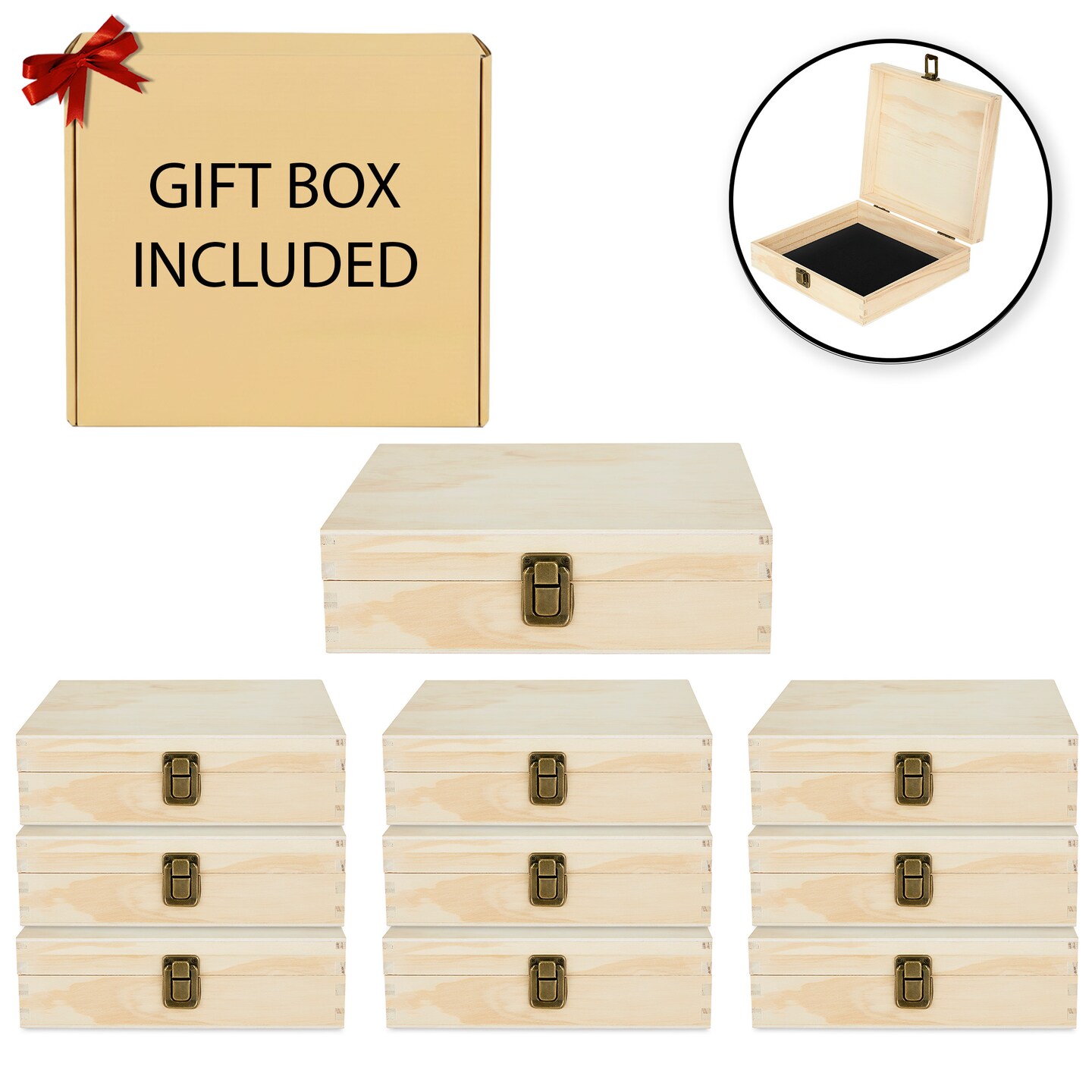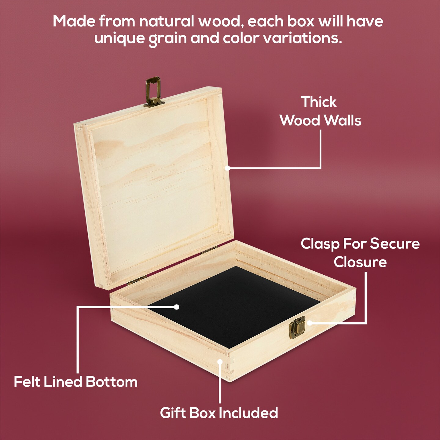 Makerflo Natural Pine Wood Cigar Box, Hinged Back & Front Clasp, Black Felt Lined, 8.5" x 8" x 2.4", Ideal for Craft - (Laser Engraving, Epoxy, UV DTF, and Vinyl)