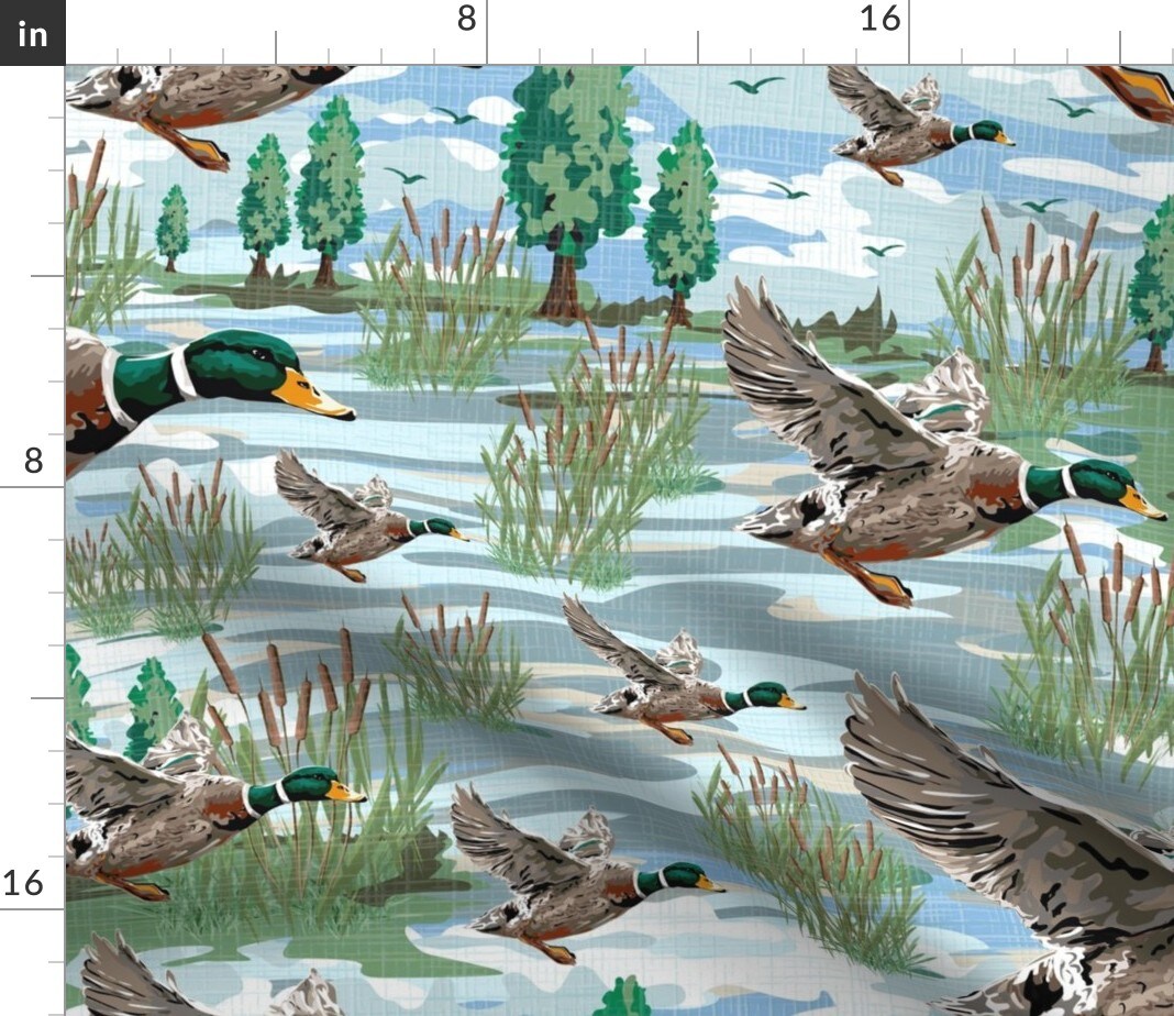 Mallard Ducks Flying Mallards Waterfowl Flying Birds Wildlife Bird Watching Birding Duck Season Rustic Cabin Custom Printed Fabric by Spoonflower Various Fabrics by the Yard or Fat Quarter 15664687