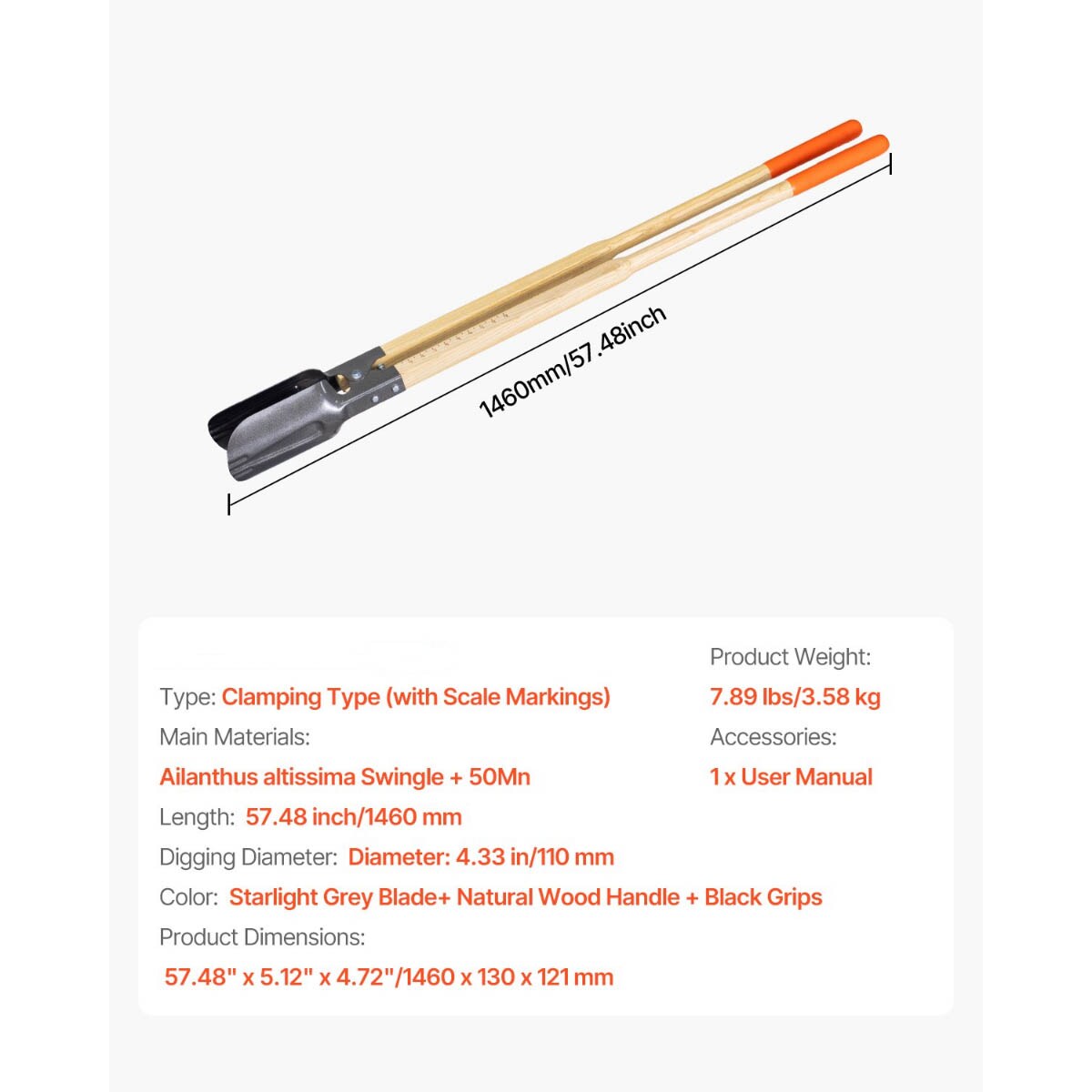 Manual Post Hole Digger 4.33-Inch Digging Diameter with Clamping Mechanism for Gardening