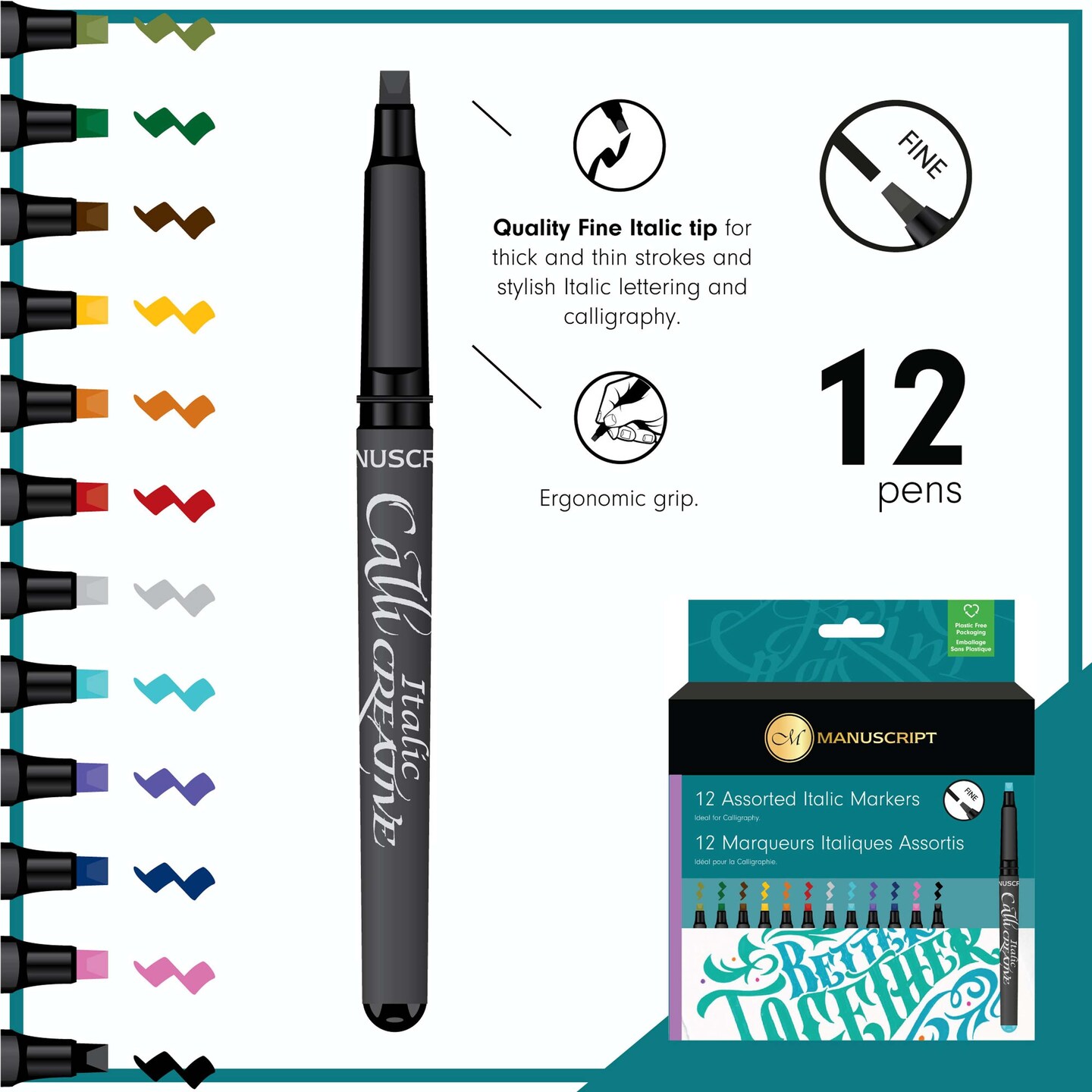 Manuscript Callicreative Italic Markers 12/Pkg-Assorted Colors, Fine Tip
