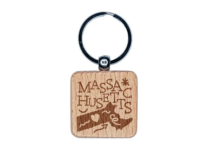 Massachusetts State with Text Swirls Engraved Wood Square Keychain Tag Charm