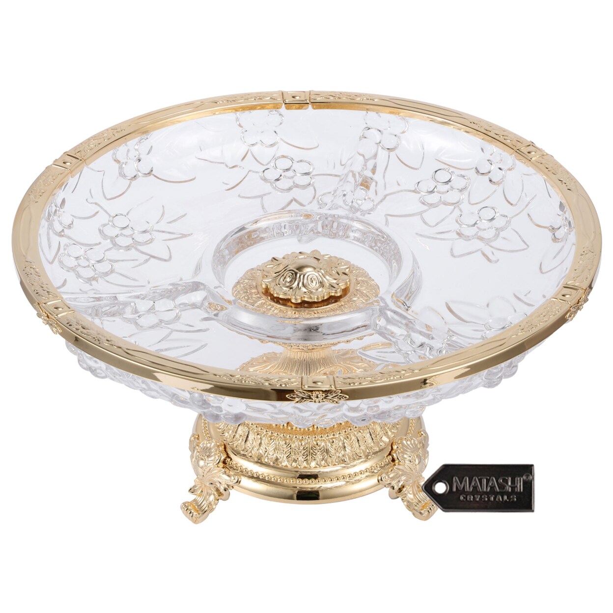 Matashi 3 Sectional Compote Centerpiece Decorative Bowl, Round Serving Platter w 24K Gold Plated Pedestal Base for