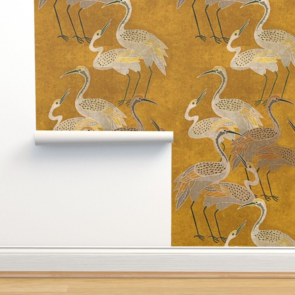 Maximalism Art Deco Birds Boho Hollywood Regency Crane Exotic Birds Dramatic Glamour Vintage Inspired Large Scale Luxe Quirky Colorful Custom Pre-pasted Wallpaper by Spoonflower Pre-Pasted Wallpaper 2FT Wide