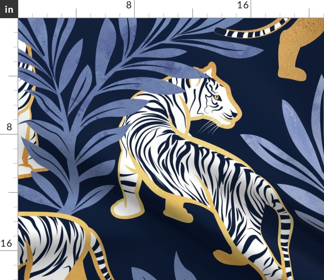 Maximalist Tiger Animalier Bold Graphic Blue White Gold Large Scale Animal Print Custom Printed Fabric by Spoonflower Various Fabrics by the Yard or Fat Quarter