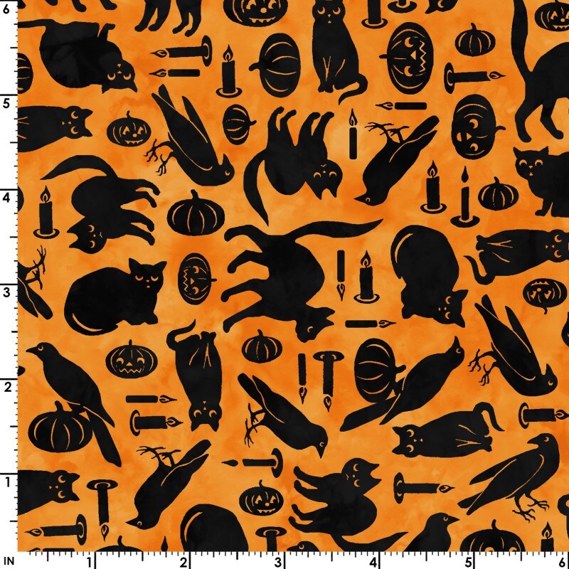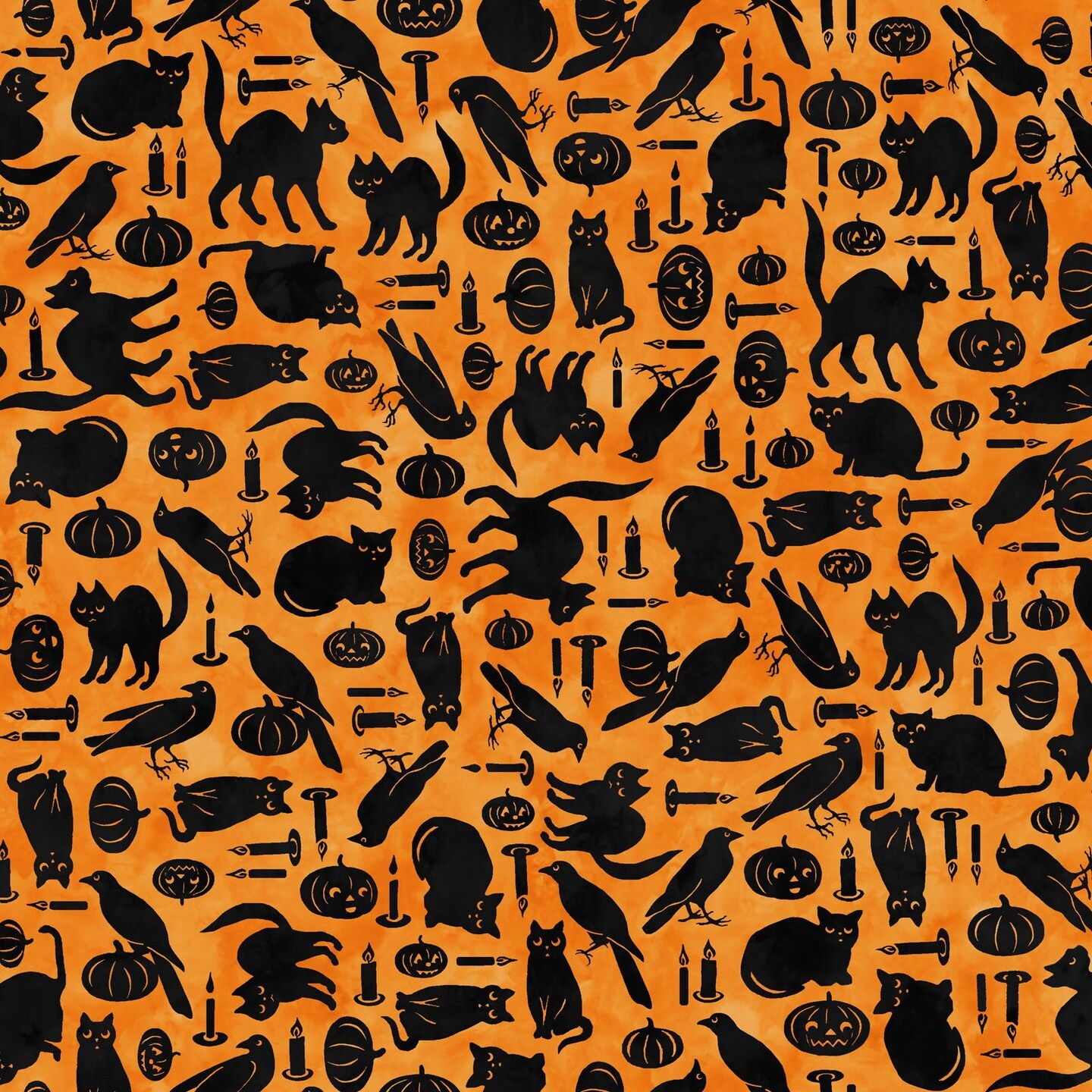 Maywood Studio Halloween Spooky Hollow Cats and Crows on Orange 100% Cotton Fabric By the Yard