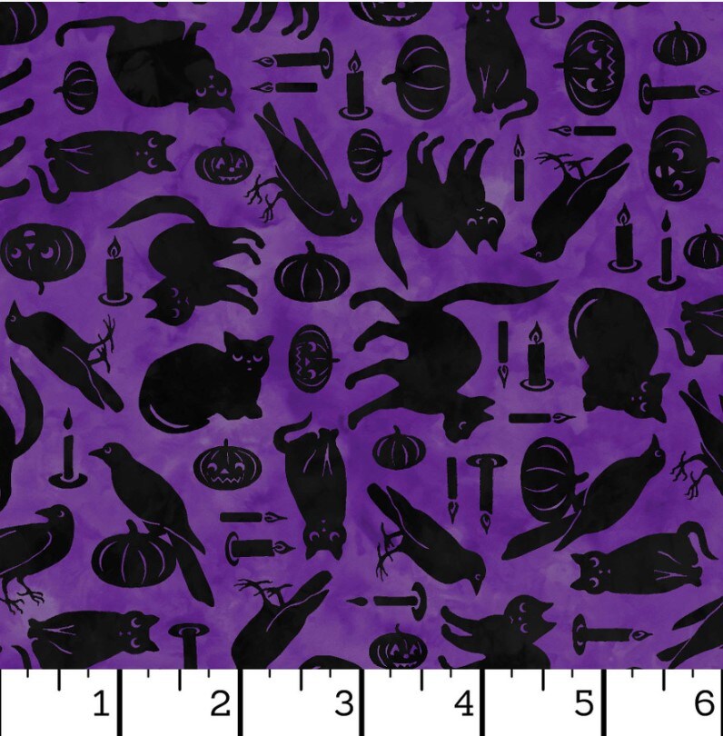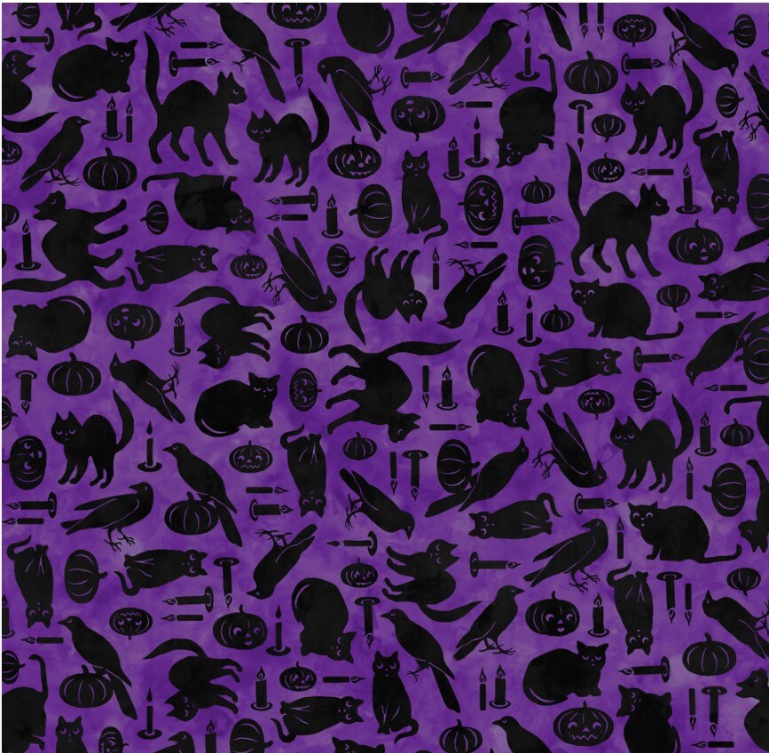 Maywood Studio Halloween Spooky Hollow Cats and Crows on Purple 100% Cotton Fabric By the Yard