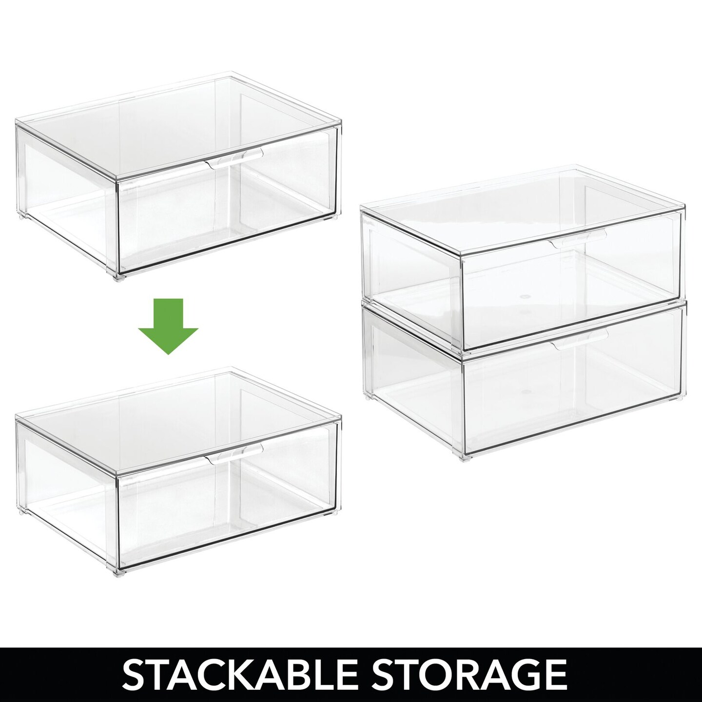 mDesign Plastic Stacking Closet Storage Organizer Bin with Drawer, 4 Pack, Clear