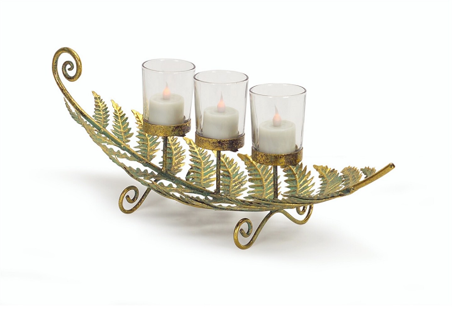 Melrose 18" Golden Patina Laying Fern with Three Votive Cups Table Top Decoration