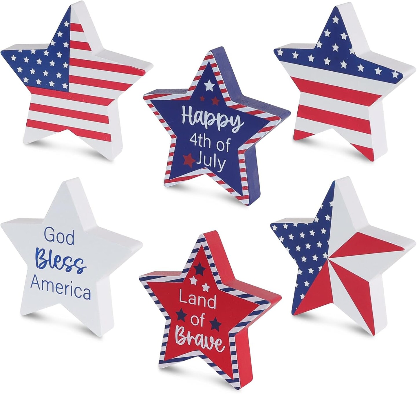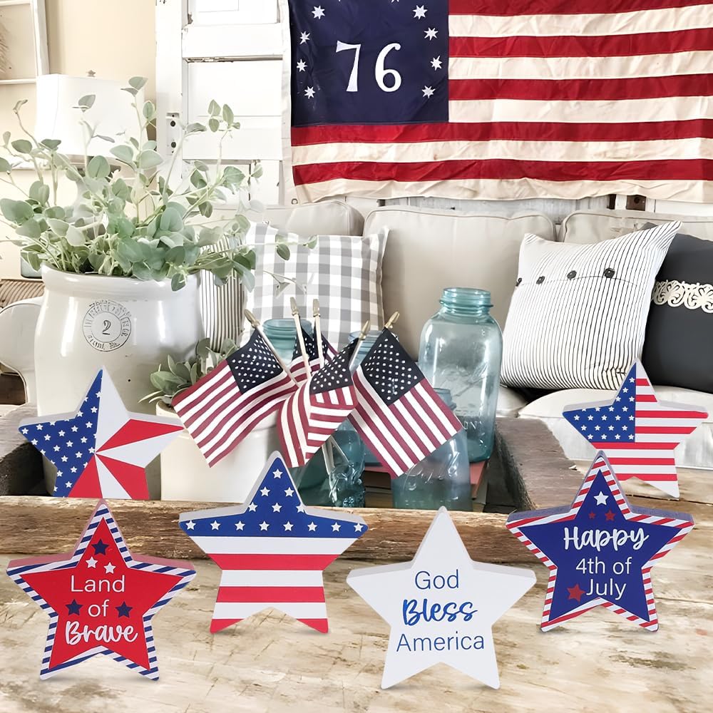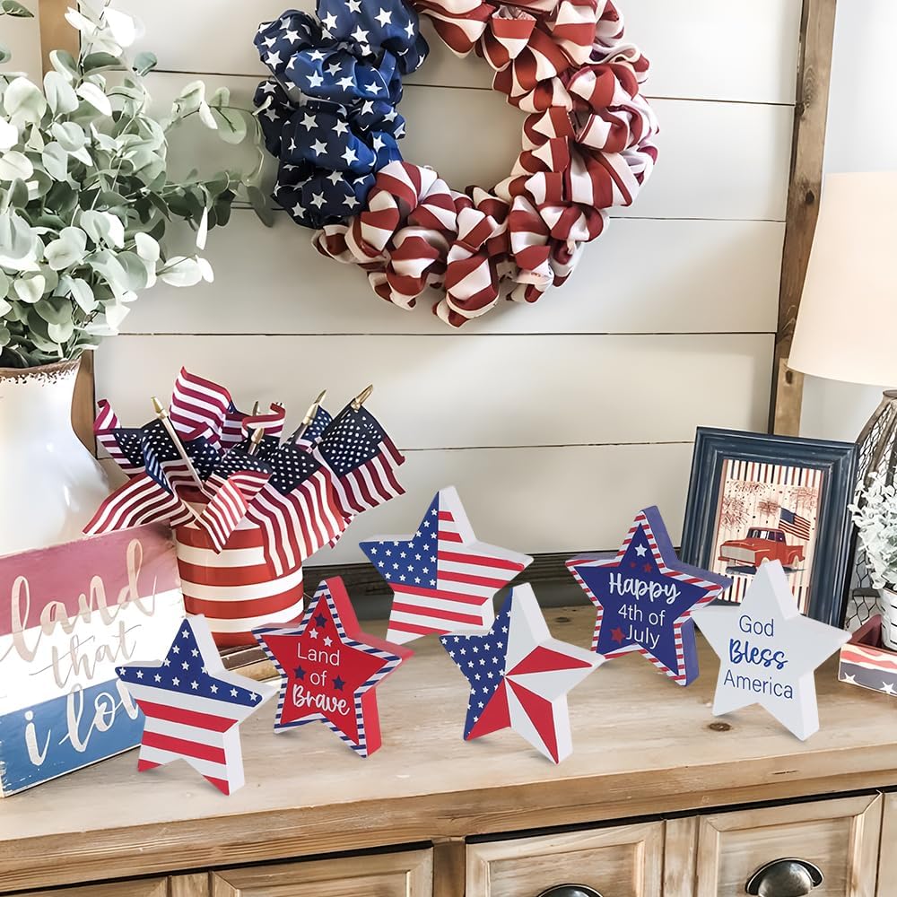 Memorial Day Decorations, 4th of July Decorations, 6Pcs Patriotic Wood Star Block Sign for Independence, Red White Blue American Fourth of July Tabletop Decor for Tiered Tray, Table, Home