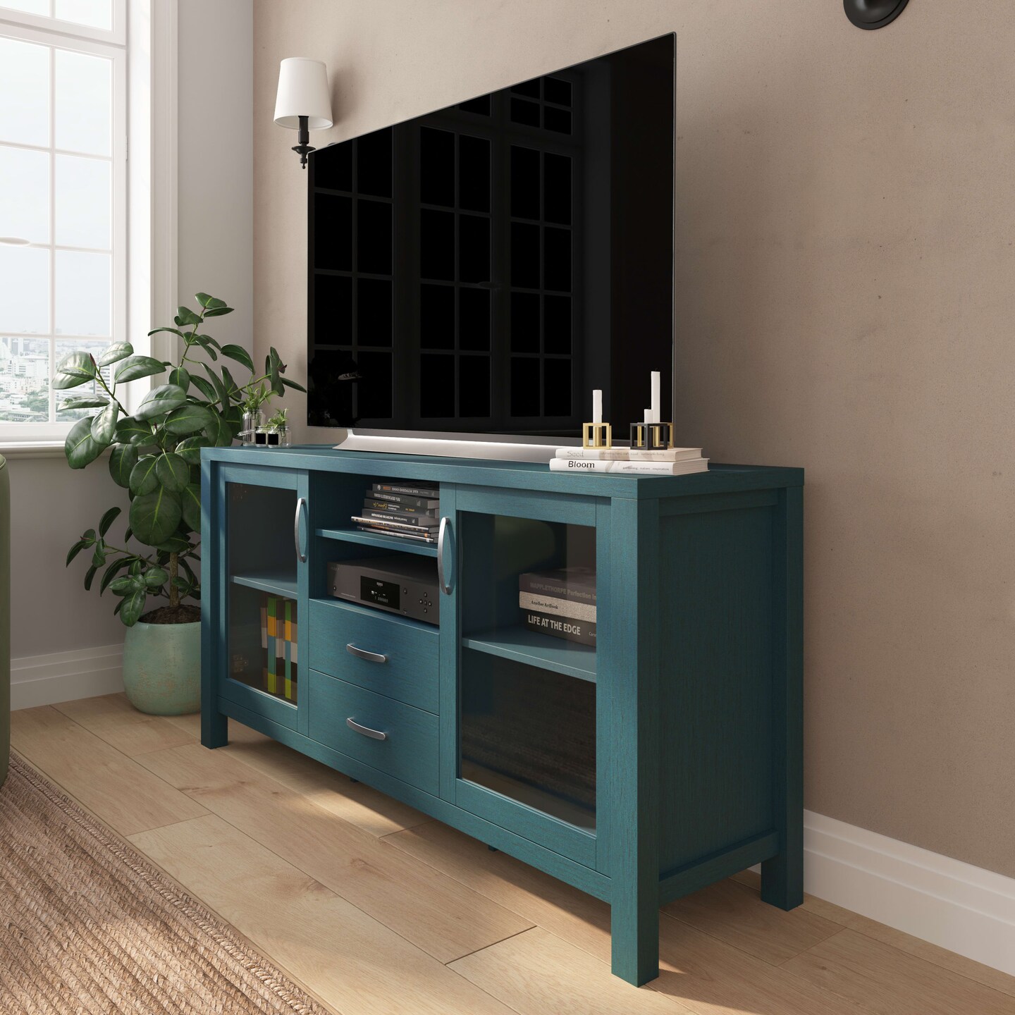 Merrick Lane Agustin Two-Drawer Engineered Wood Buffet Sideboard Cabinet with Open Shelf, Two Tempered Glass Cabinet Doors for Dining Room/Kitchen