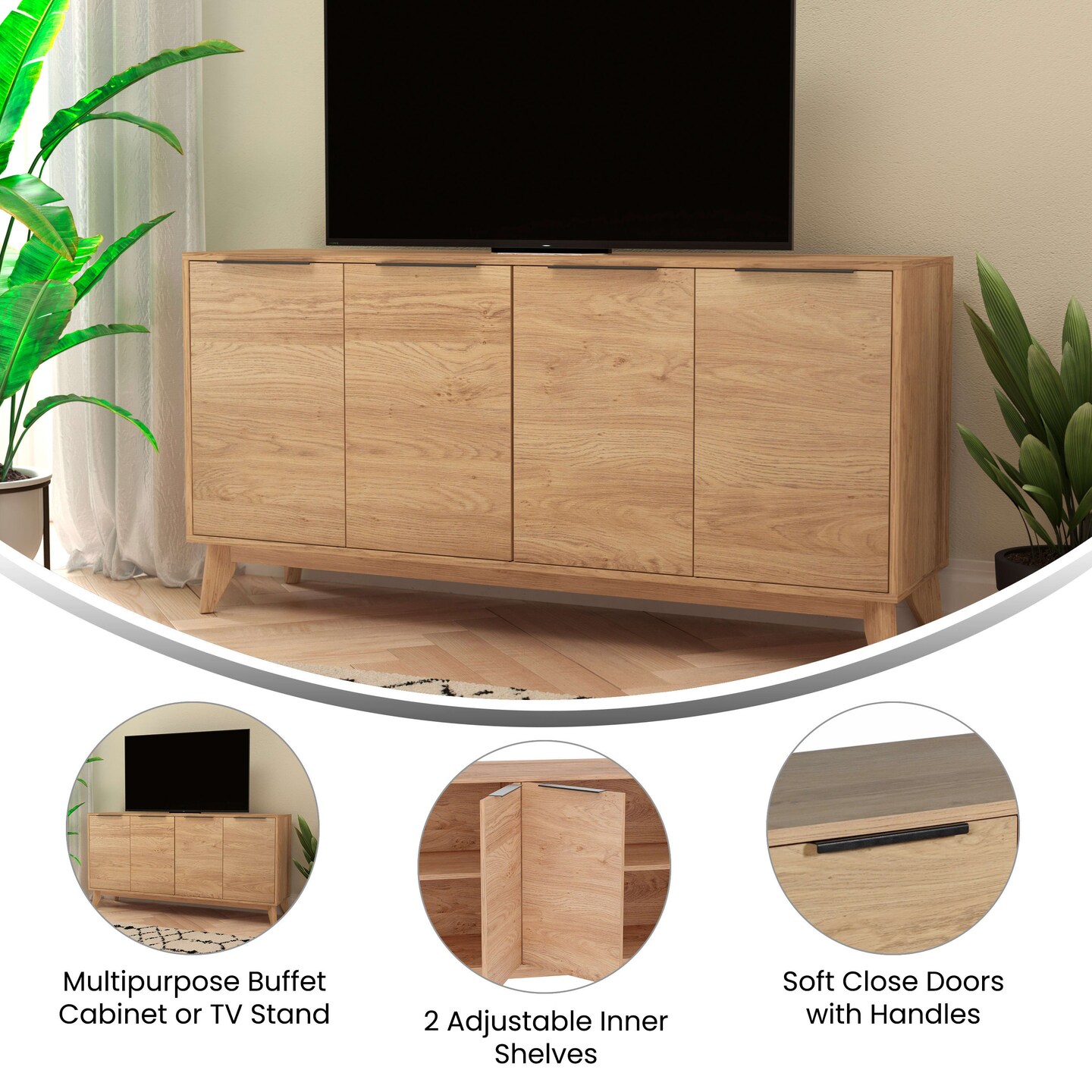 Merrick Lane Blakely Mid-Century Modern Four Door Buffet, TV Stand with Shelving