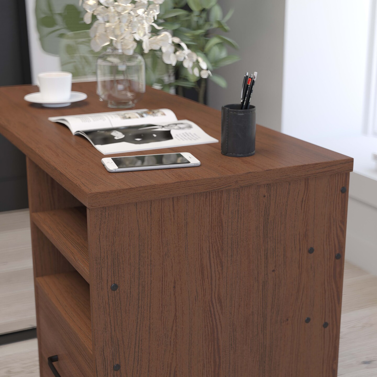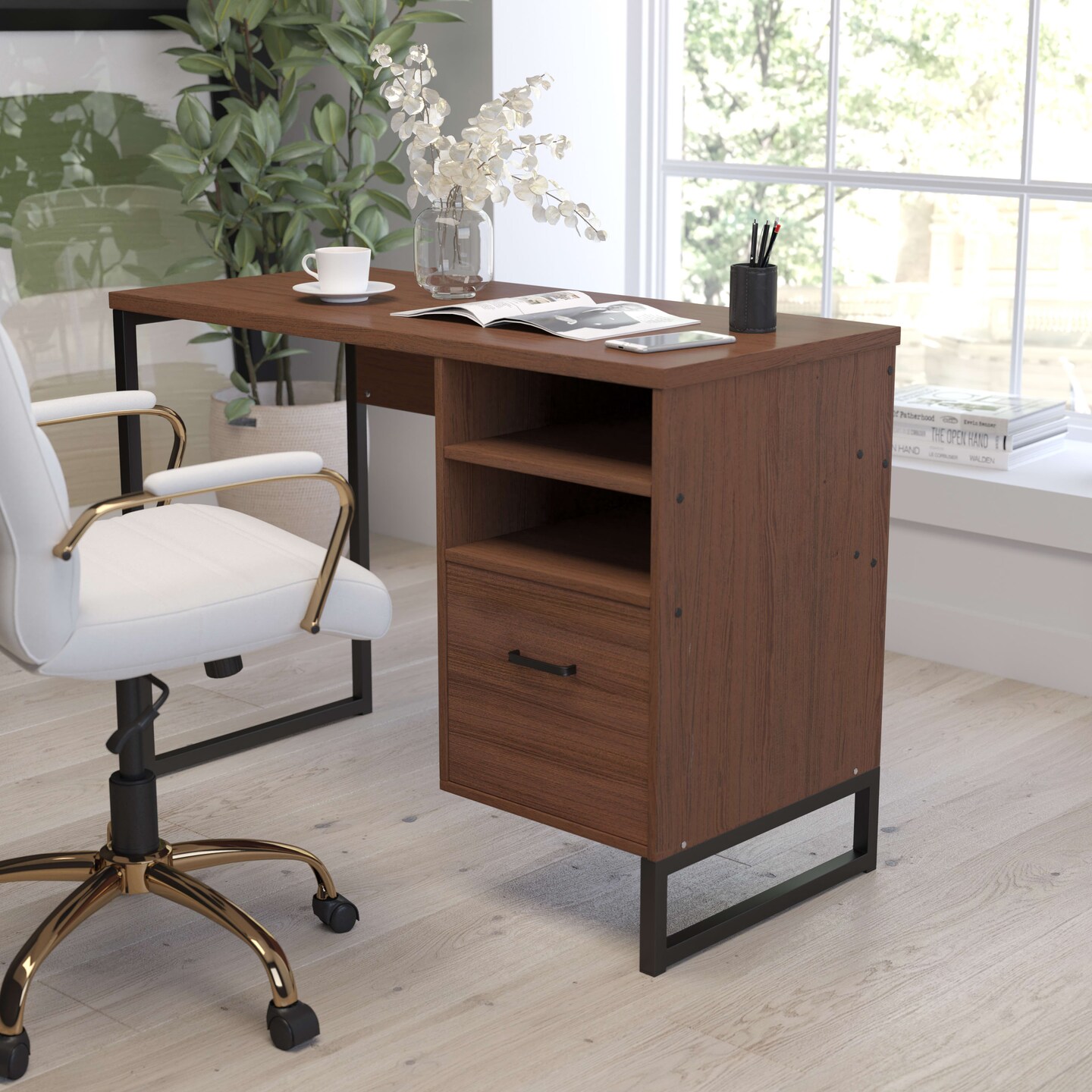 Merrick Lane Brighton Rustic Computer Desk with Shelving and Storage Drawer Metal Frame Pedestal Base Home Office Desk