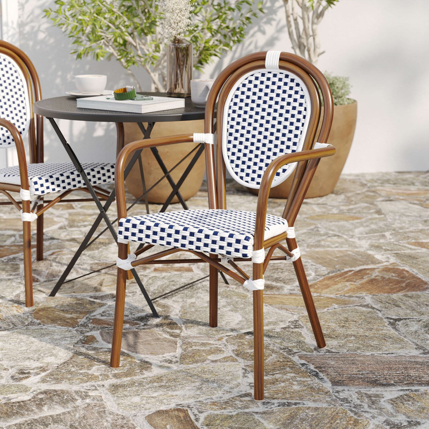 Merrick Lane Celia Stacking Thonet Bistro Style Chair with Arms, PE Rattan Seat, and Metal Frame for Indoor/Outdoor Use