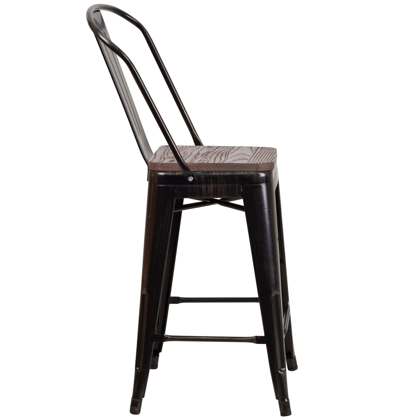 Merrick Lane Donnely Metal Dining Stool with Curved Slatted Back and Textured Wood Seat