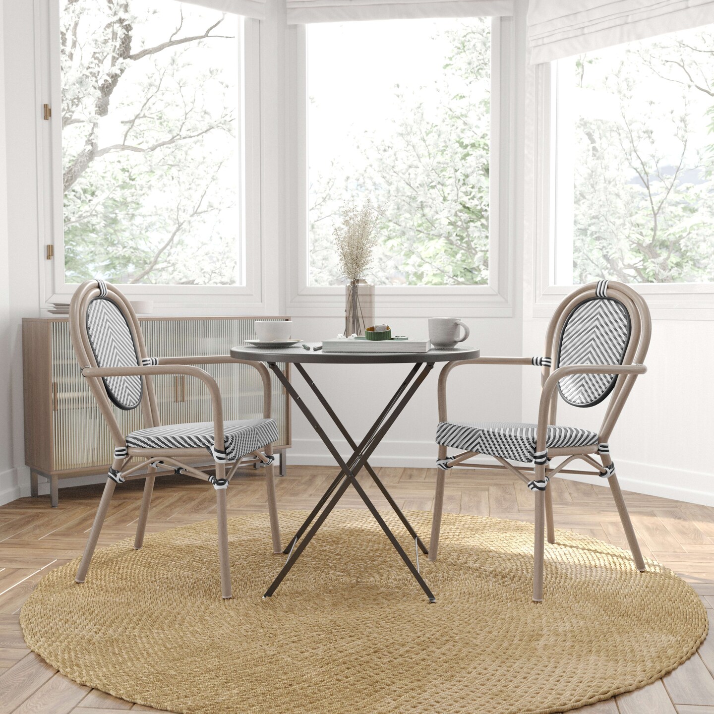 Merrick Lane Mael Stacking Thonet Bistro Style Chair with Arms, Textilene Seat, and Bamboo Finished Metal Frame for Indoor/Outdoor Use