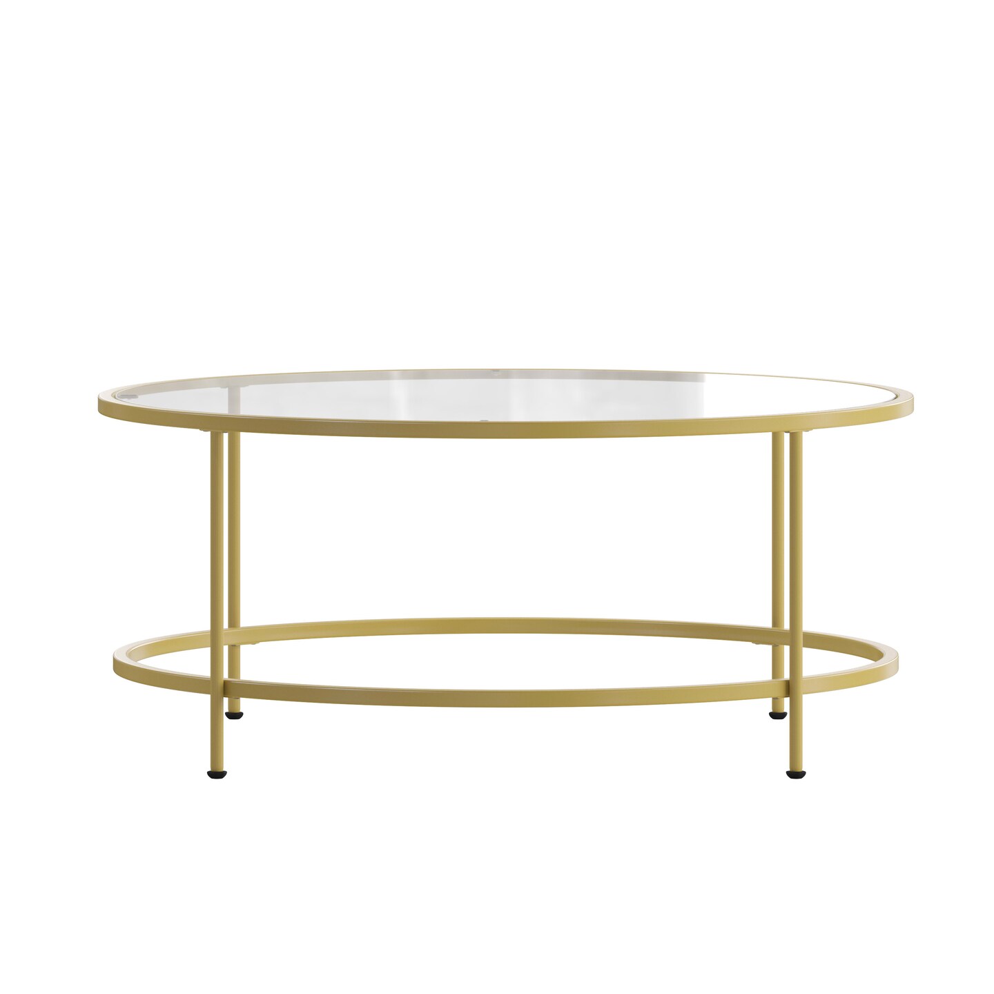 Merrick Lane Newbury Glass Coffee Table with Round Matte Gold Frame and Vertical Legs