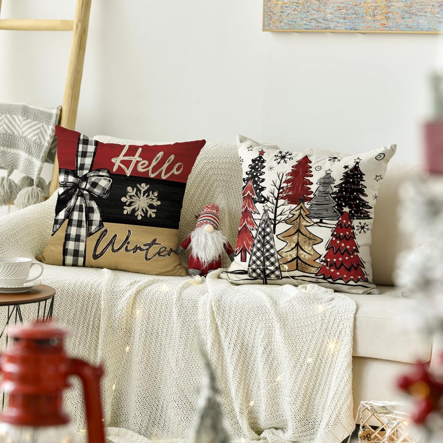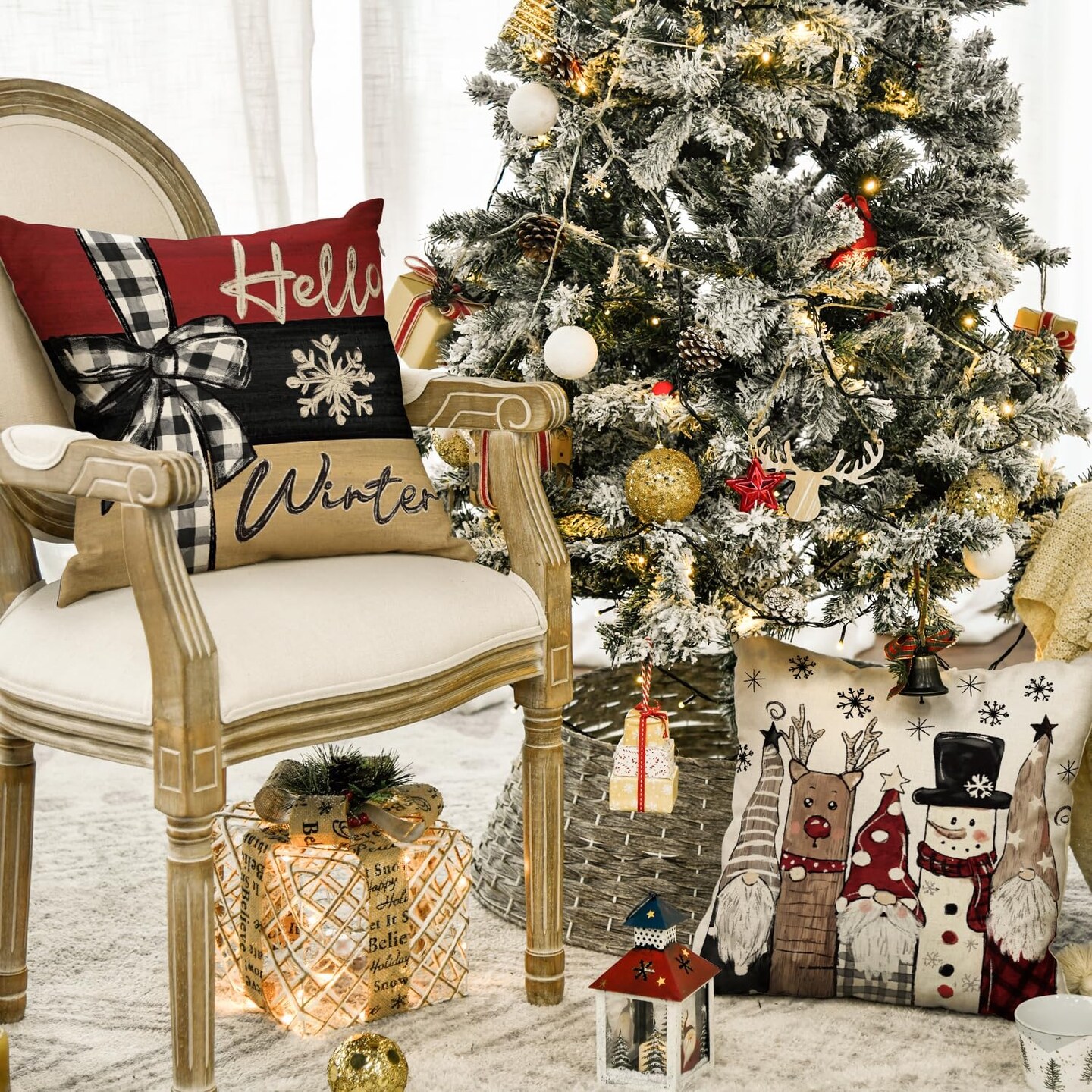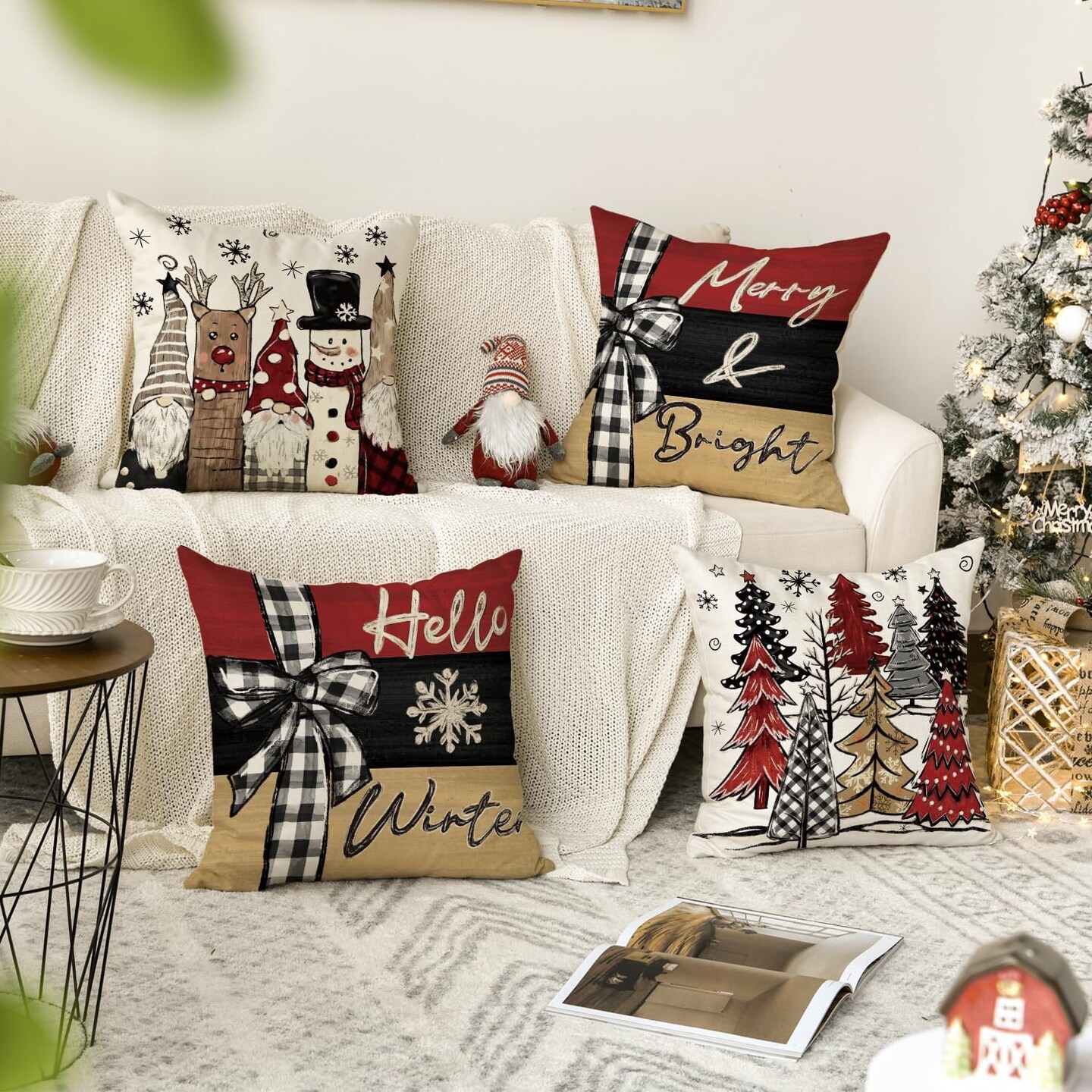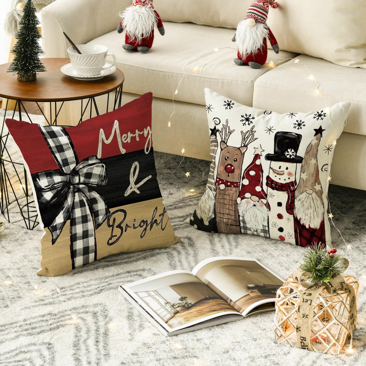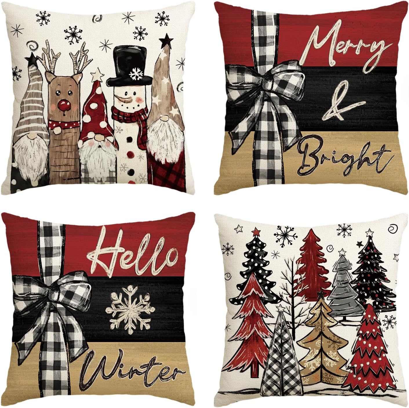 Merry & Bright Christmas Snowman Reindeer Gnome Throw Pillow Covers, 18 x 18 Inch Xmas Trees Hello Winter Holiday Cushion Case Decoration for Sofa Couch Set of 4