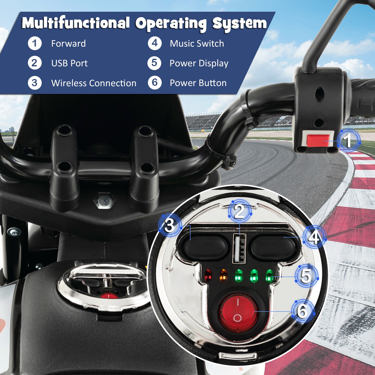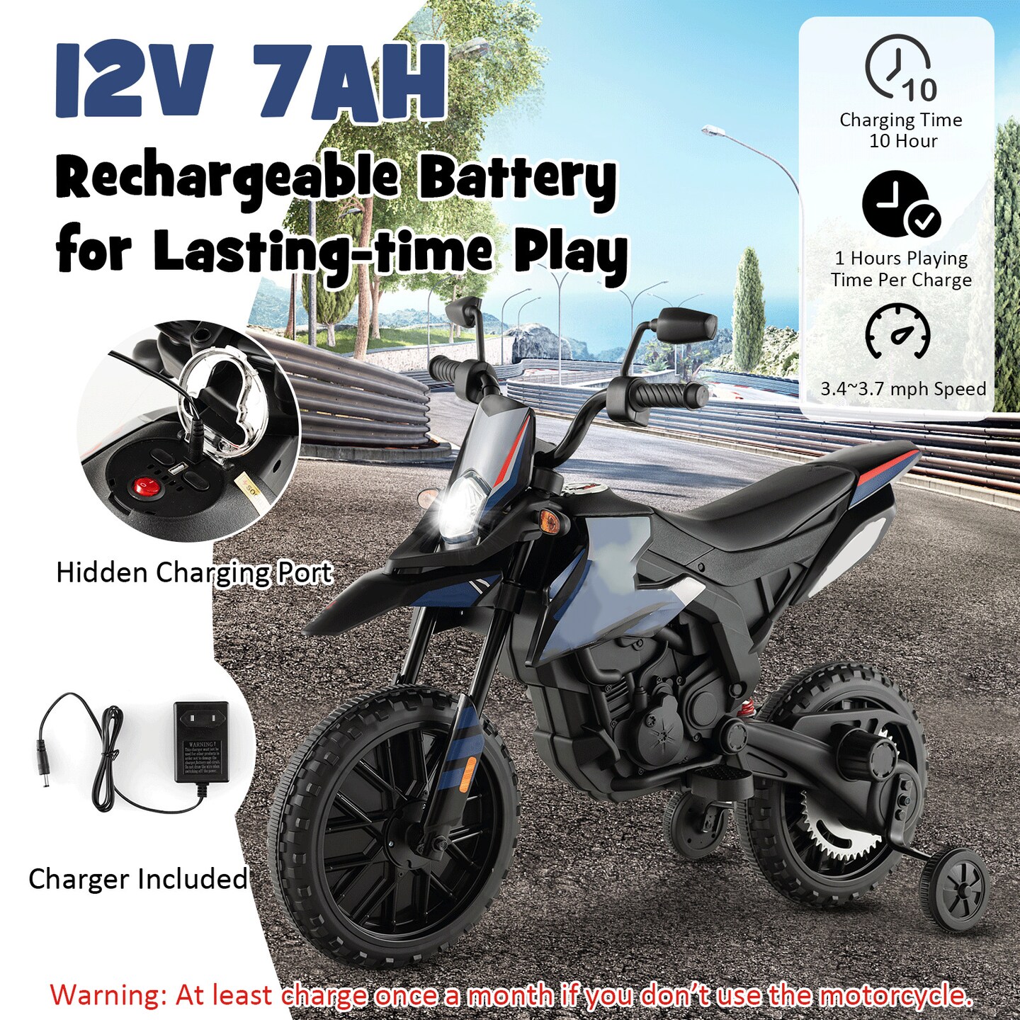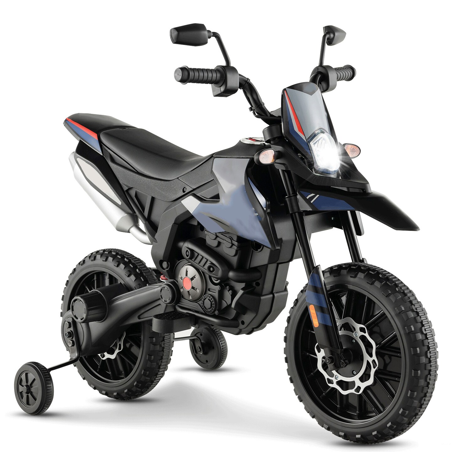 Metal 12V Kids Motorcycle with Dual Motors, Music and Training Wheels