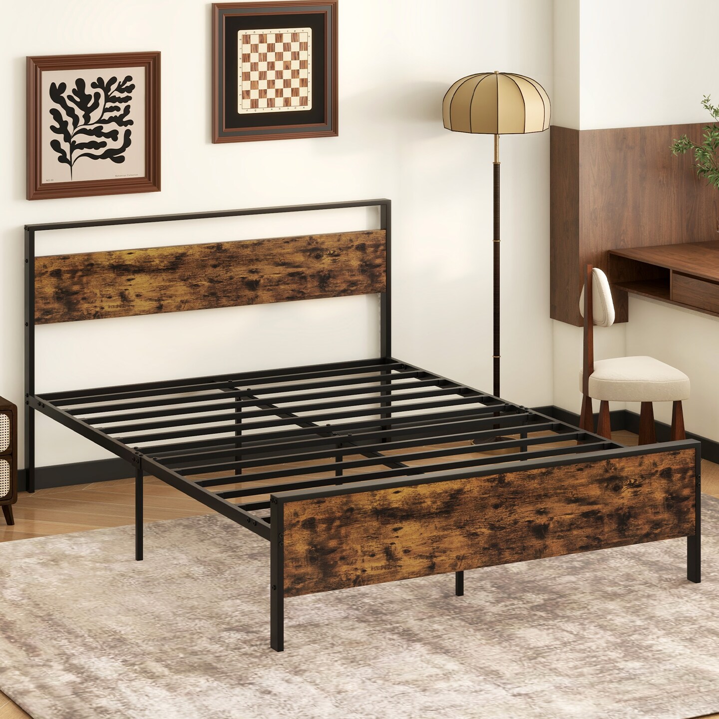 Metal Bed Frame Industrial Platform Bed with Wooden Headboard