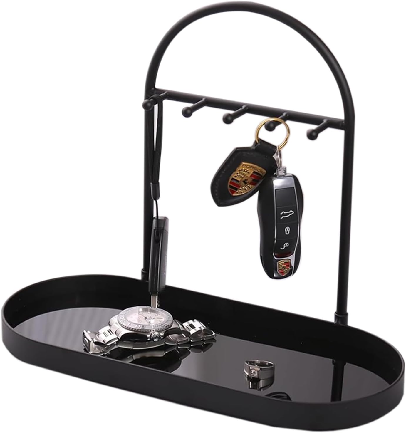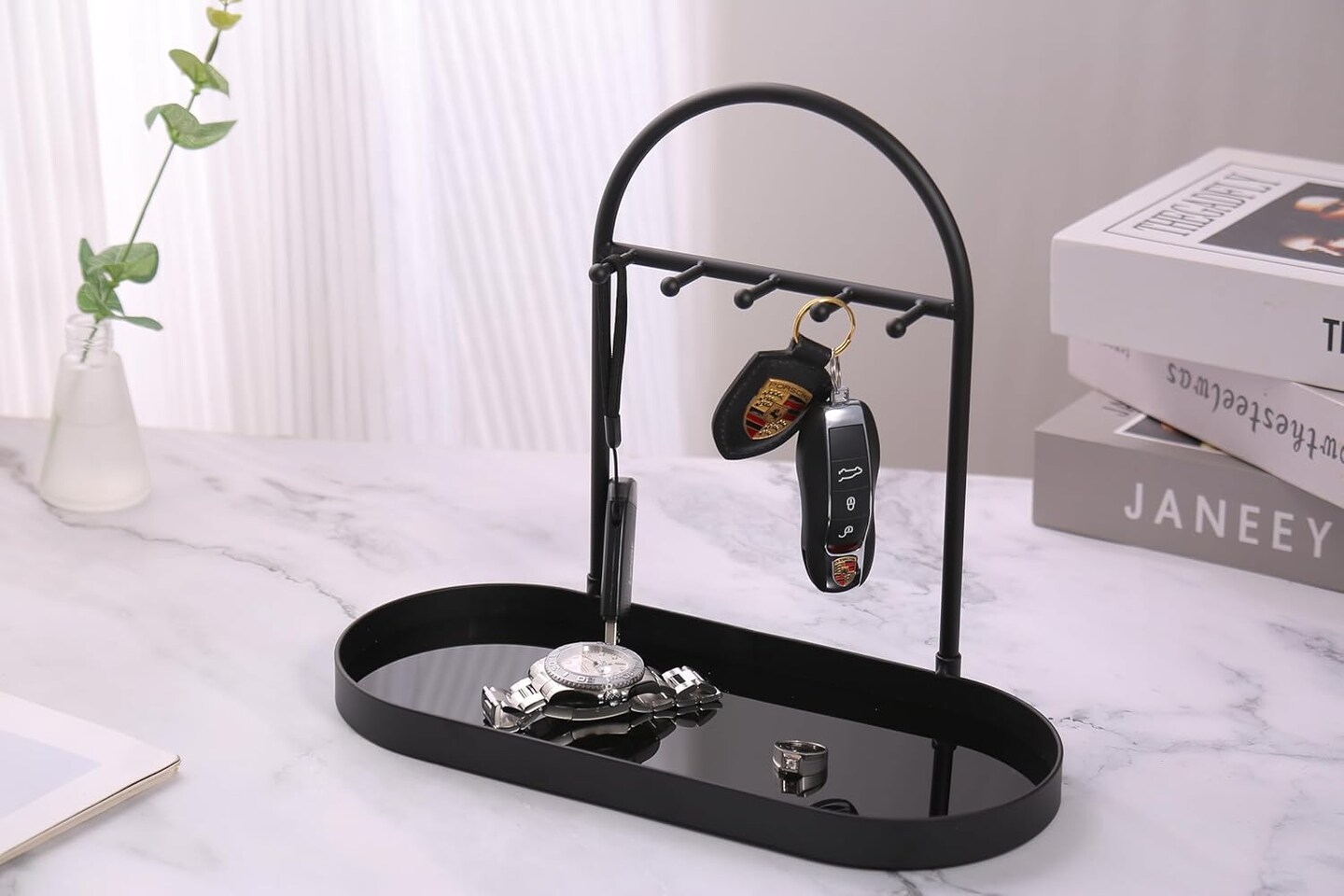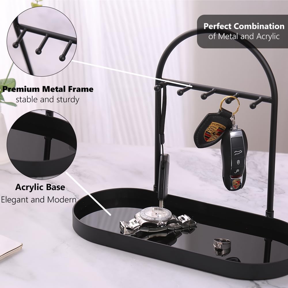 Metal Jewelry & Key Organizer Stand with Acrylic Base – 5-Hook Valet Tray for Keys, Rings, and Jewelry (Matte Black)