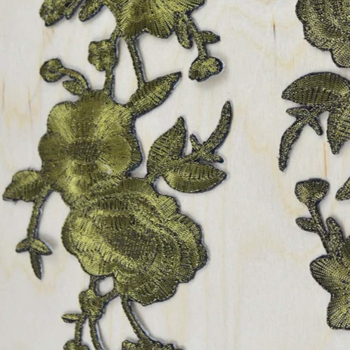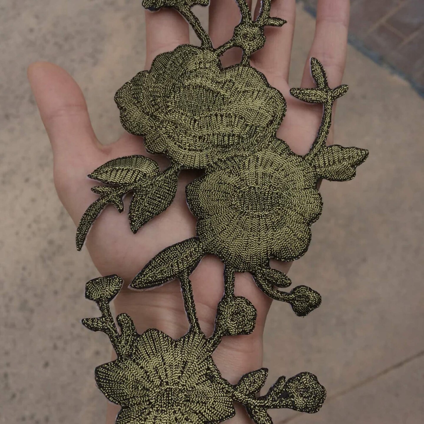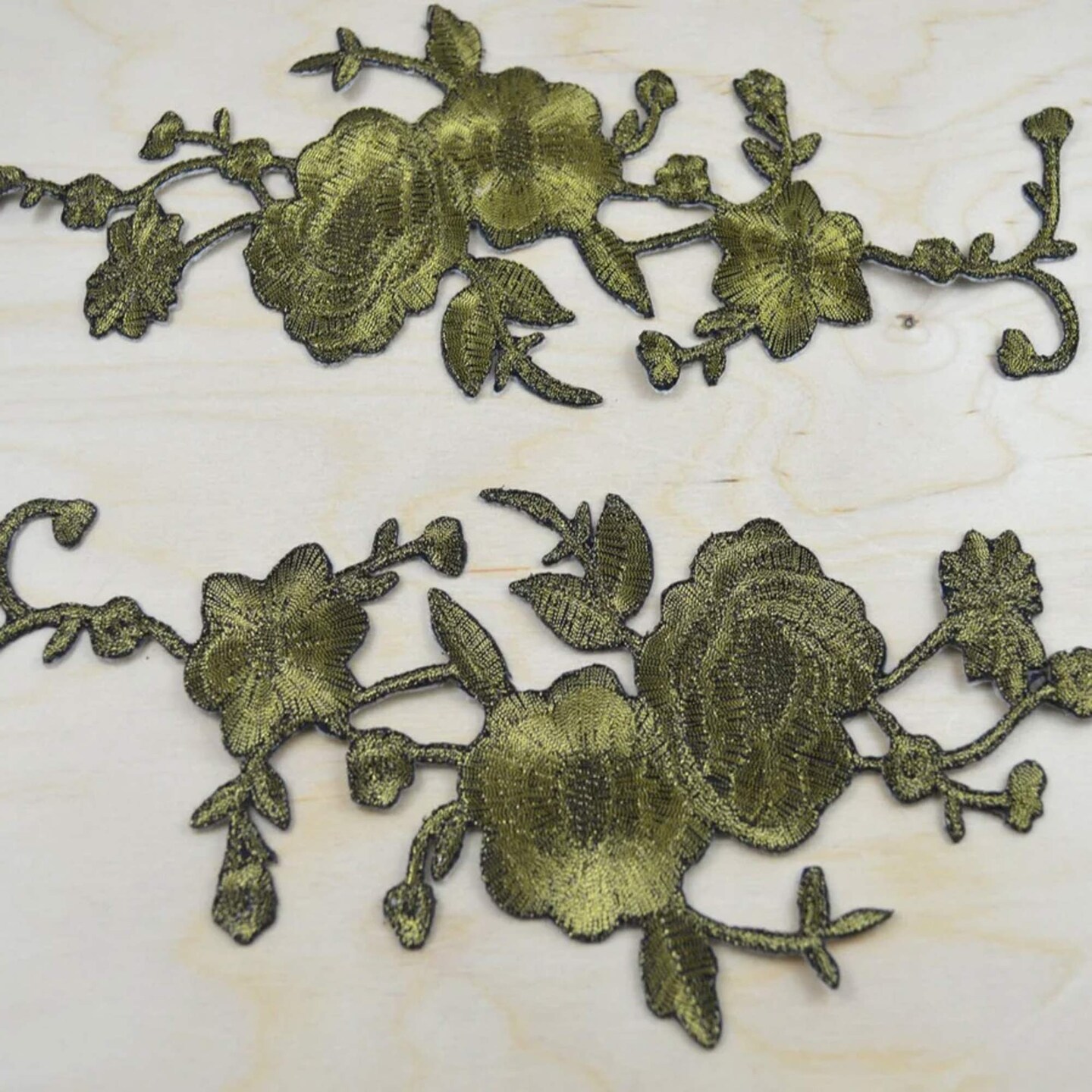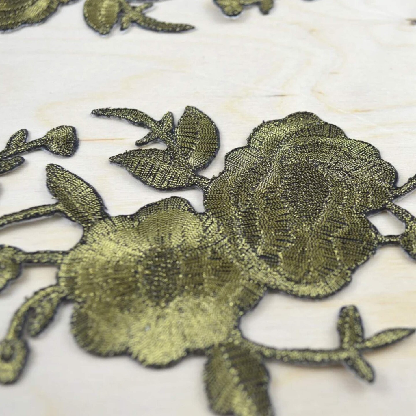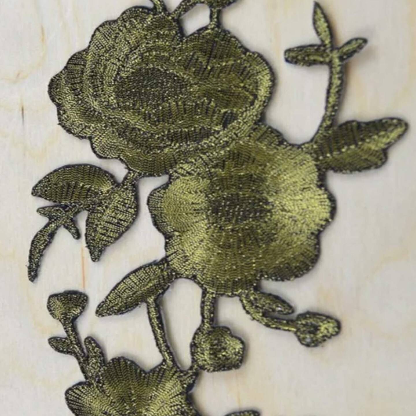 Metallic Brass Flower Applique Embroidered Iron-On Patch Pair with Stems & Leaves