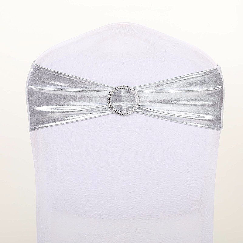 Metallic Spandex Chair Sashes Silver Round Buckles