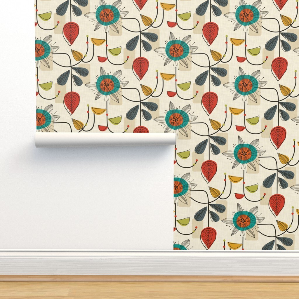 Mid Century Retro Floral Block Colour Cream Beige Geometric Shapes Atomic Age Custom Removable Wallpaper by Spoonflower Peel & Stick Wallpaper 2FT Wide