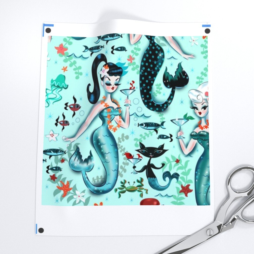 Midcentury Mod, Mermaids, Martini, Retro, Cocktail, Aqua, Cat, Starfish, Vintage, Kistch, Mod Custom Removable Wallpaper by Spoonflower Peel & Stick Wallpaper 2FT Wide