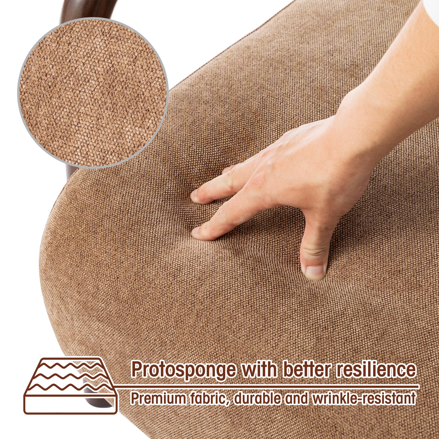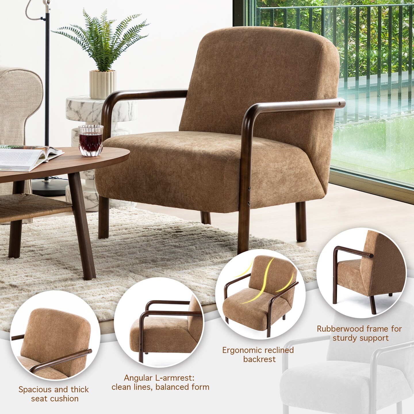 Mid-Century Modern Brown Fabric Thick Armchair with Walnut Rubberwood Frame