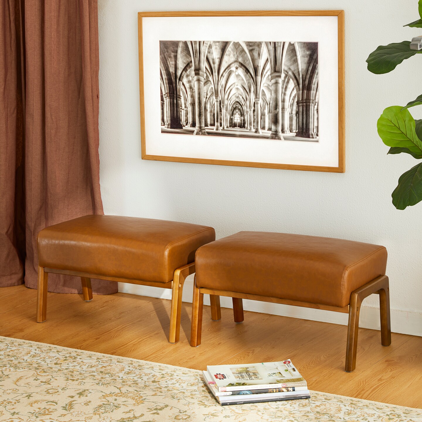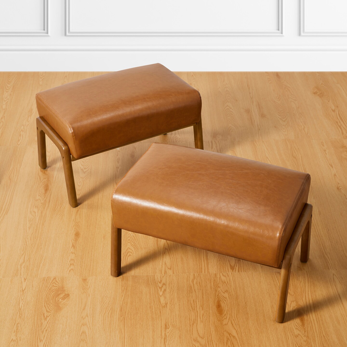 Mid-century Modern Leatherette Accent Stool with Walnut Rubberwood Legs