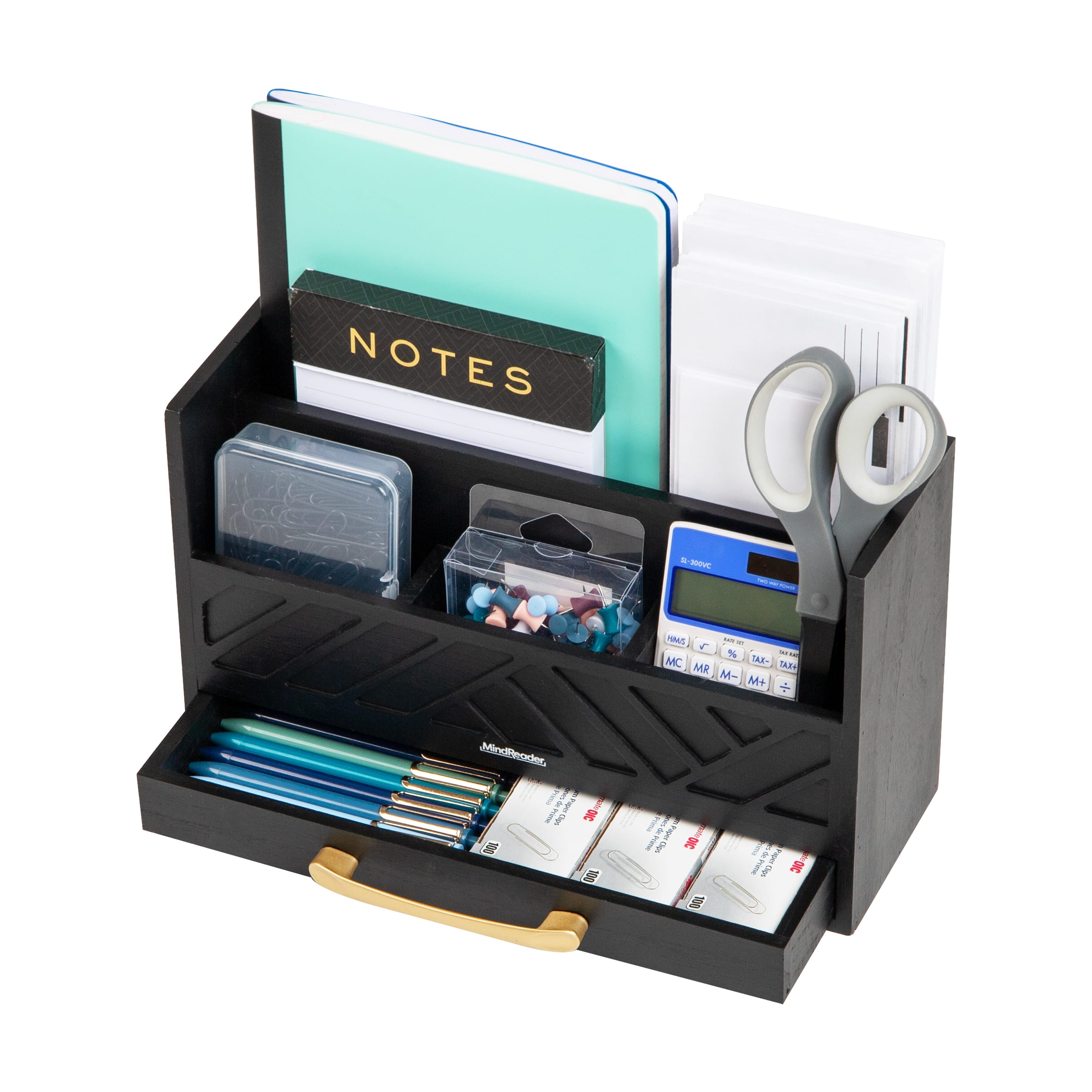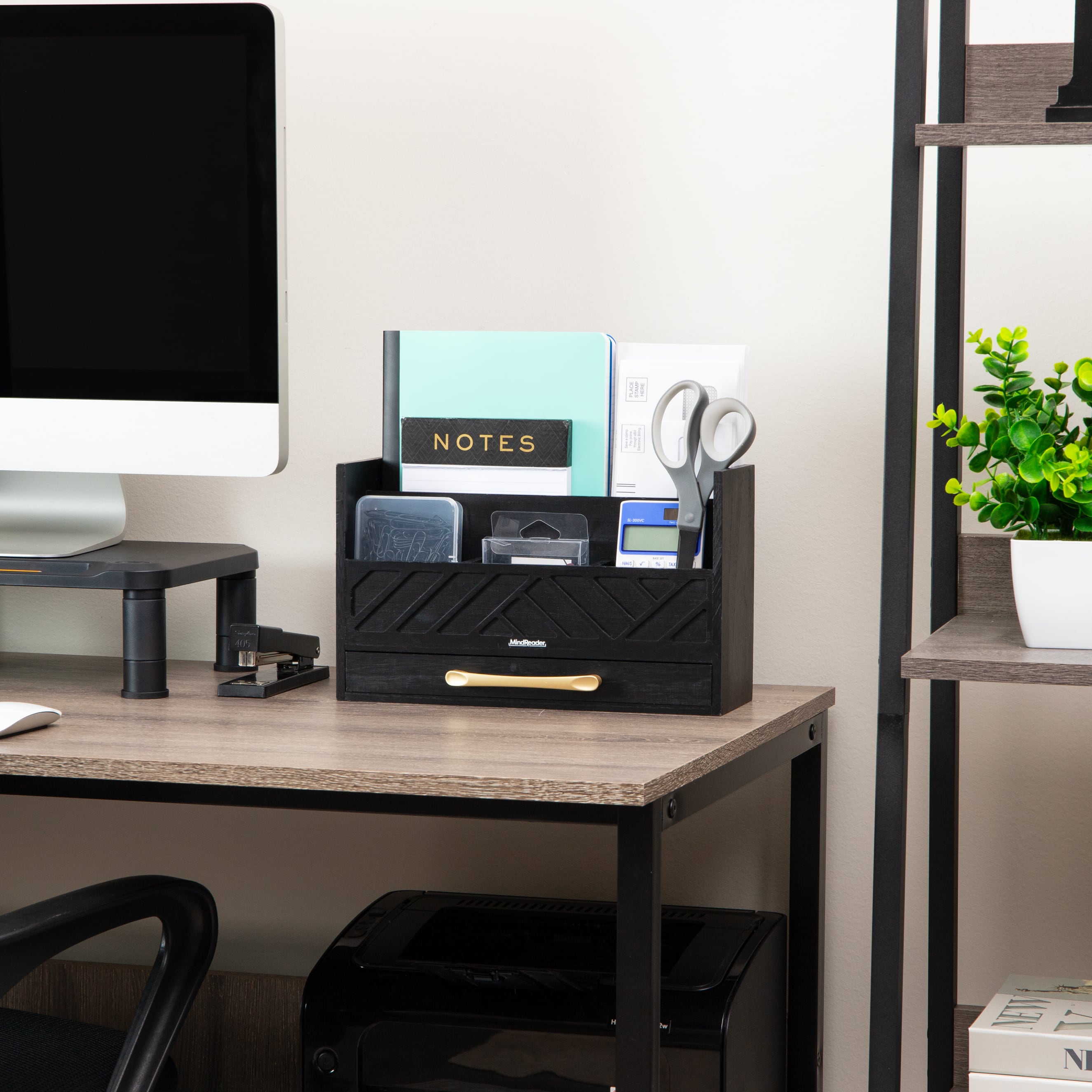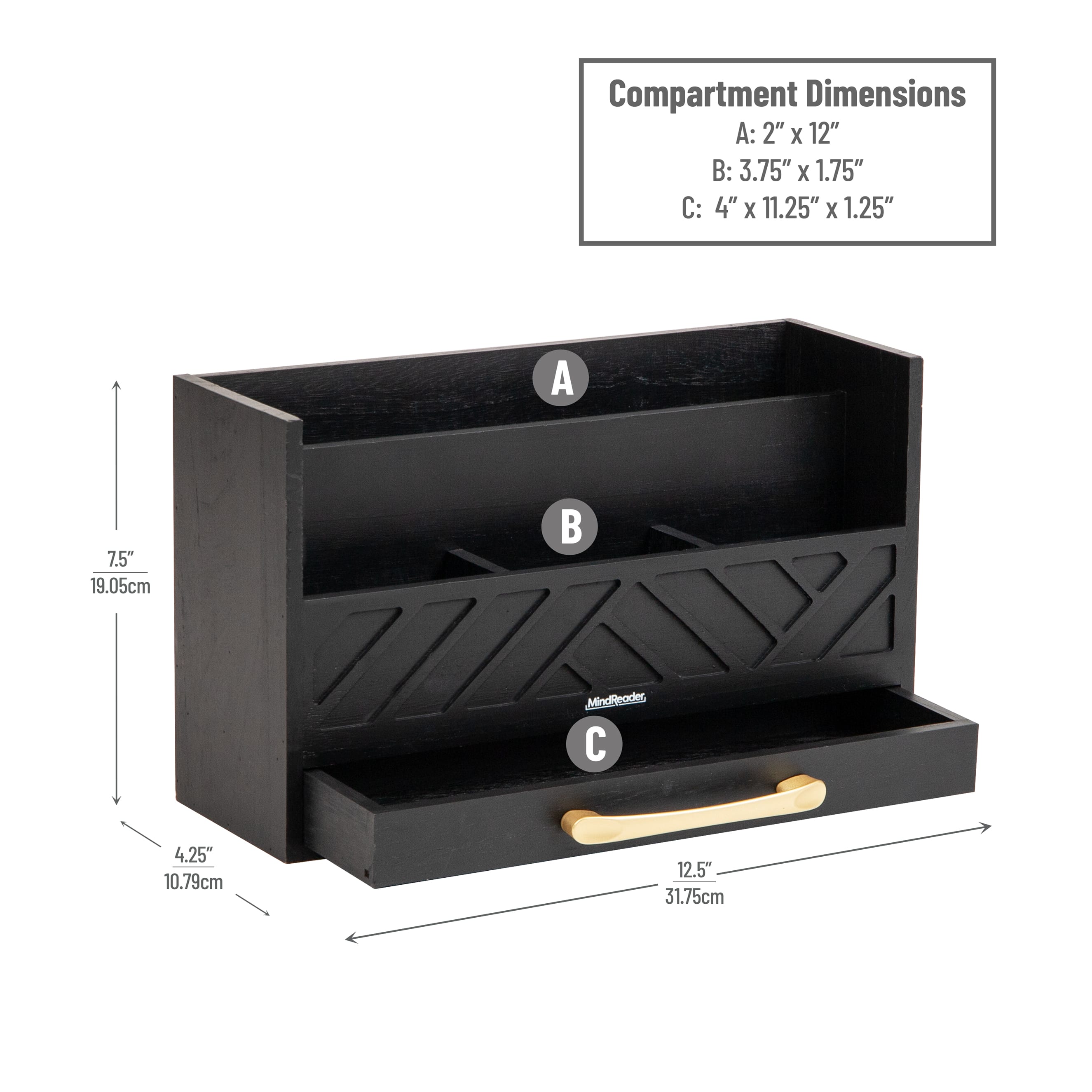 Mind Reader 5-Compartment Desktop Organizer, Rustic Wooden Storage Rack with Drawer for Papers, Accessories, and Office Supplies, Black