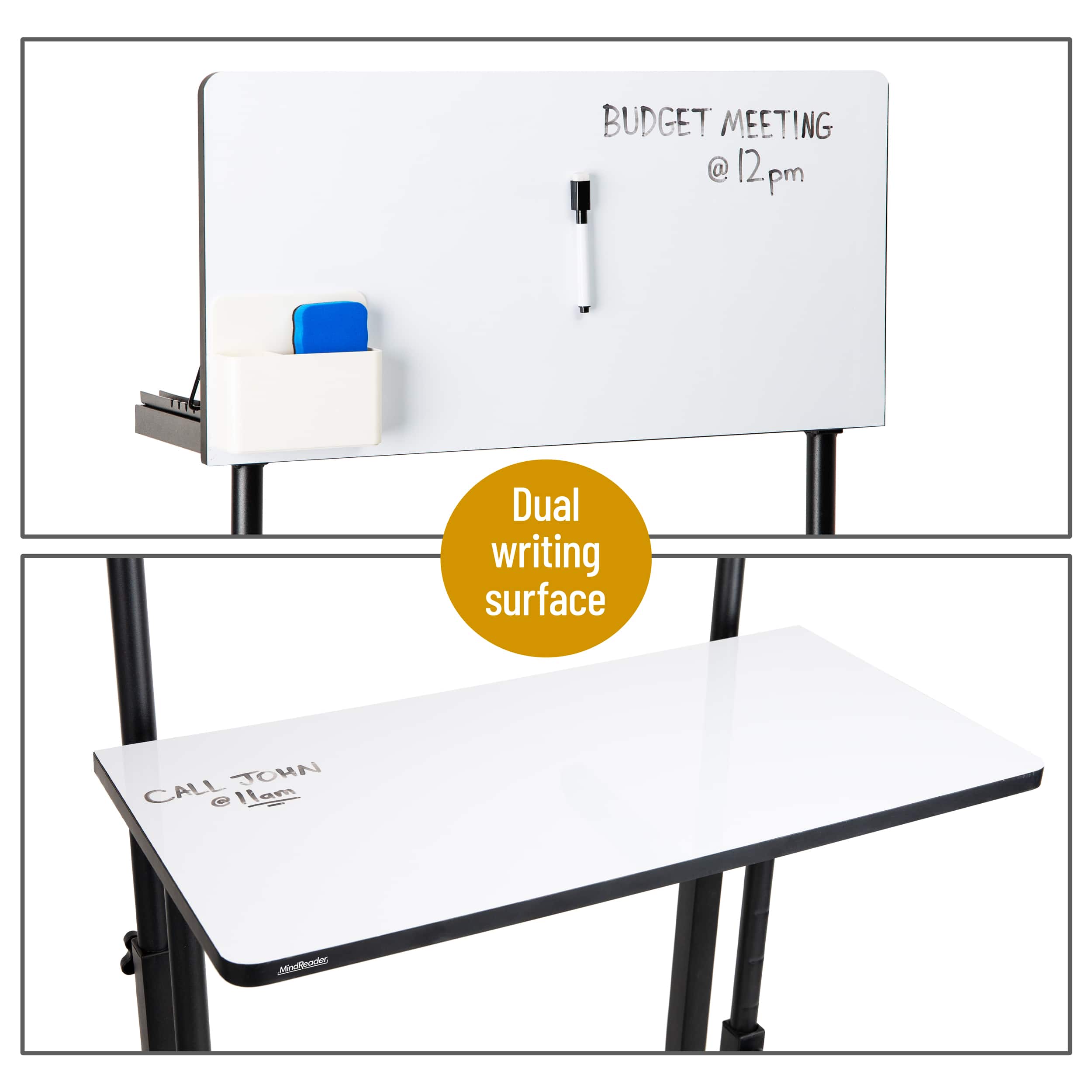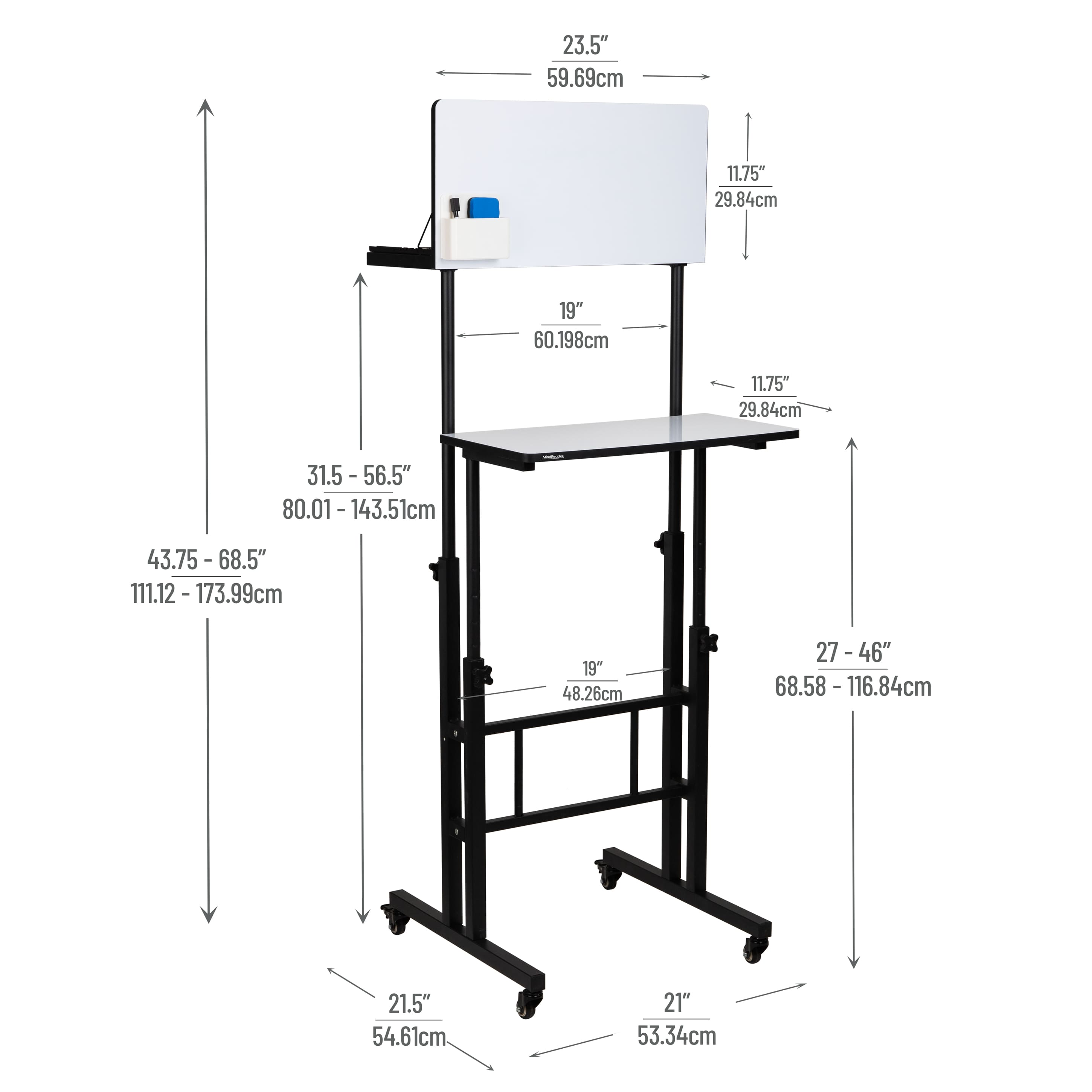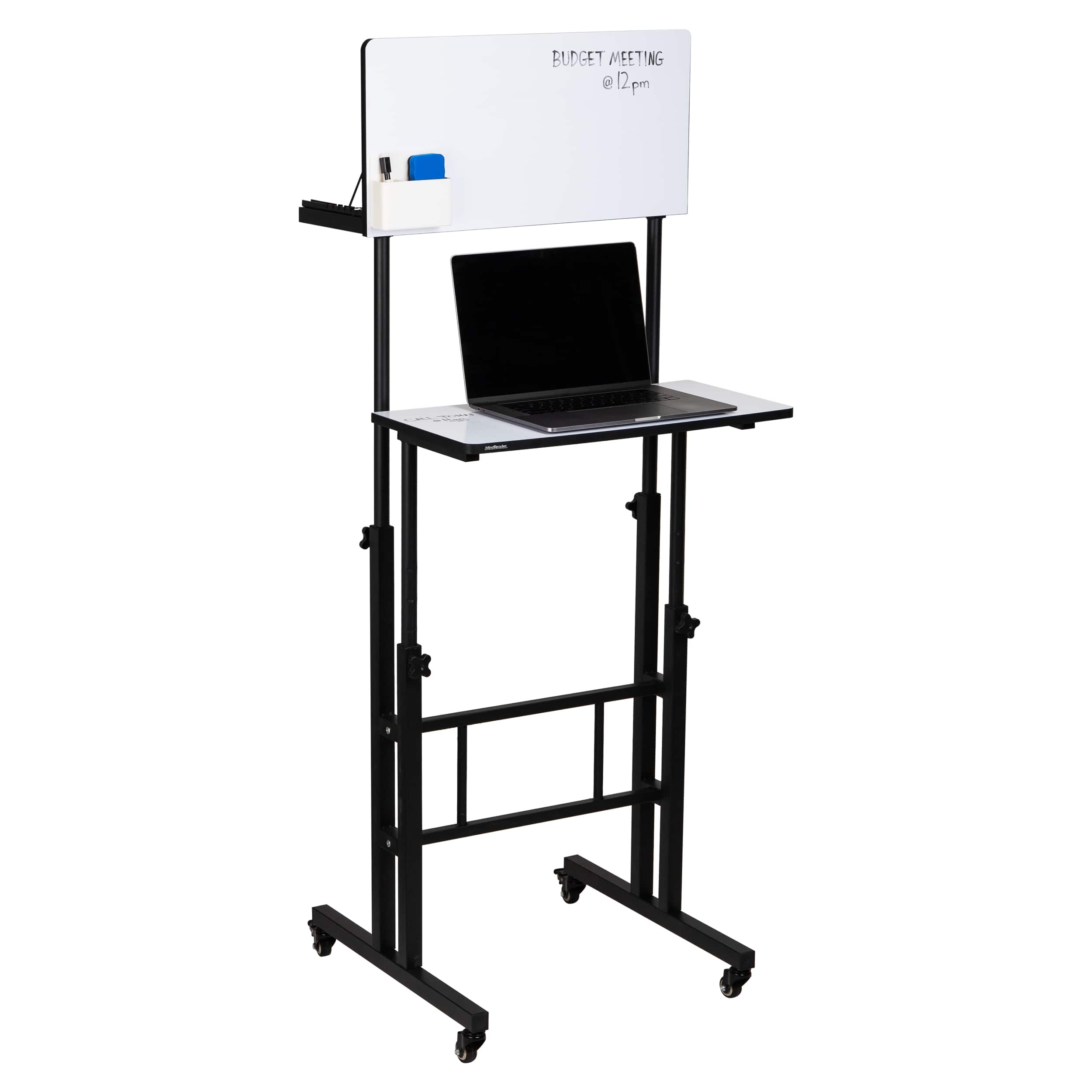 Mind Reader Standing Whiteboard Desk, Adjustable Height, Computer Desk, Laptop Desk, Portable, Rolling, 21"L x 21.5"W x 68.5"H, White