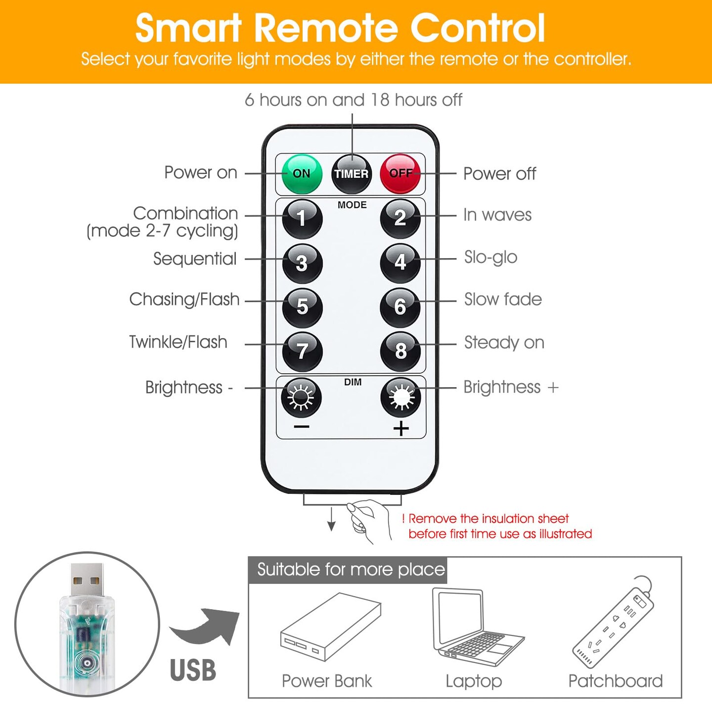 Minetom Curtain Lights, 300 LED Dimmable Fairy Lights with Remote and Timer, 8 Modes, USB Powered String Lights for Room Wall Party Xmas Indoor Decor, Warm White