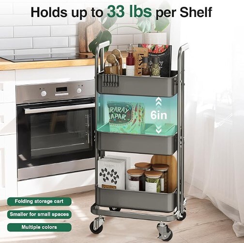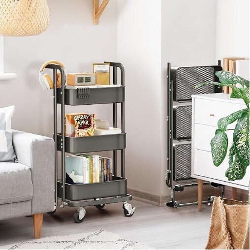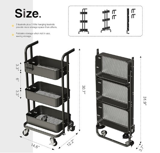 Mini 3 Tier Foldable Rolling Cart, Metal Utility Cart with Wheels, 3 Hanging Cups and 6 Hooks, Folding Trolley for Living Room, Kitchen, Bathroom, Bedroom and Office, Black (Small)